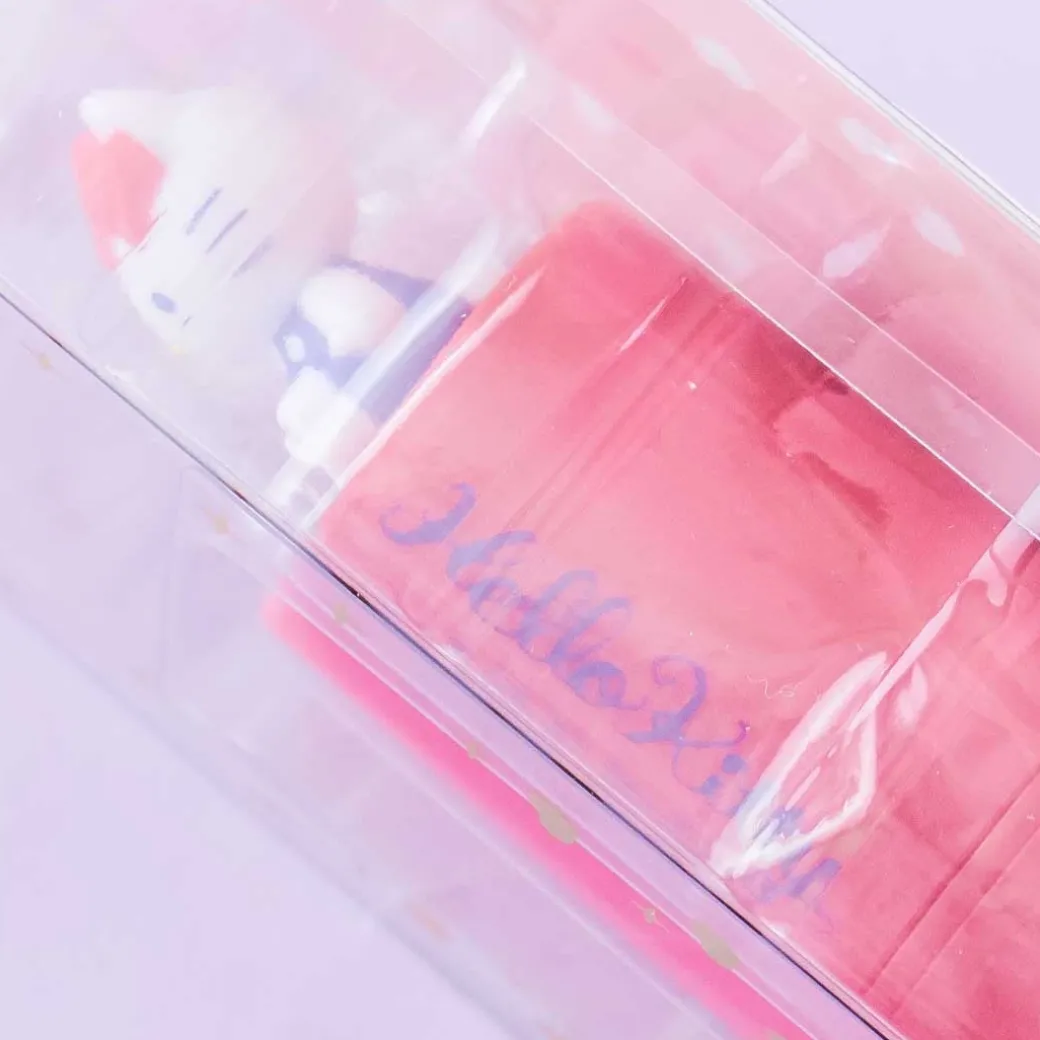 - A moisturizing clear lip balm in a tube with a sitting Hello Kitty on top