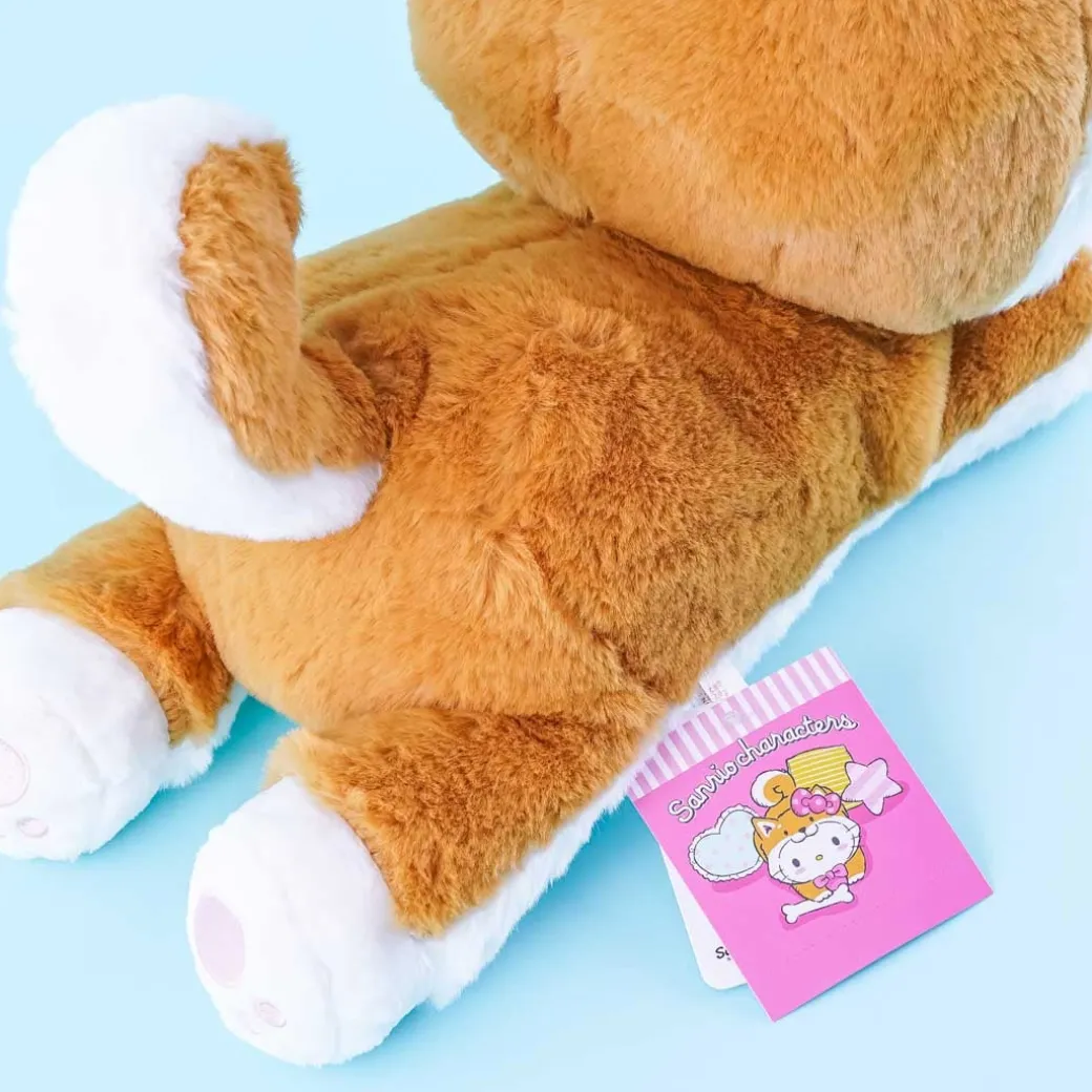 - A super cute medium-sized Hello Kitty plushie lying down on its belly wearing a Shiba Inu costume
