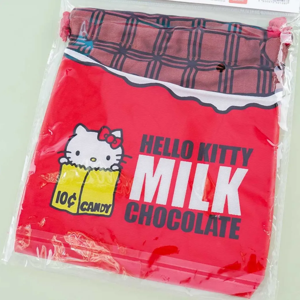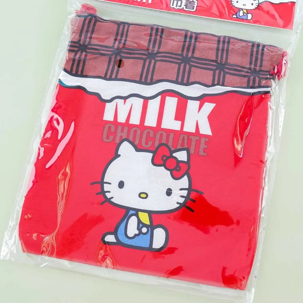 - A drawstring pouch with cute prints of Hello Kitty in a choco bar label