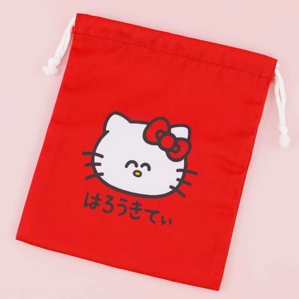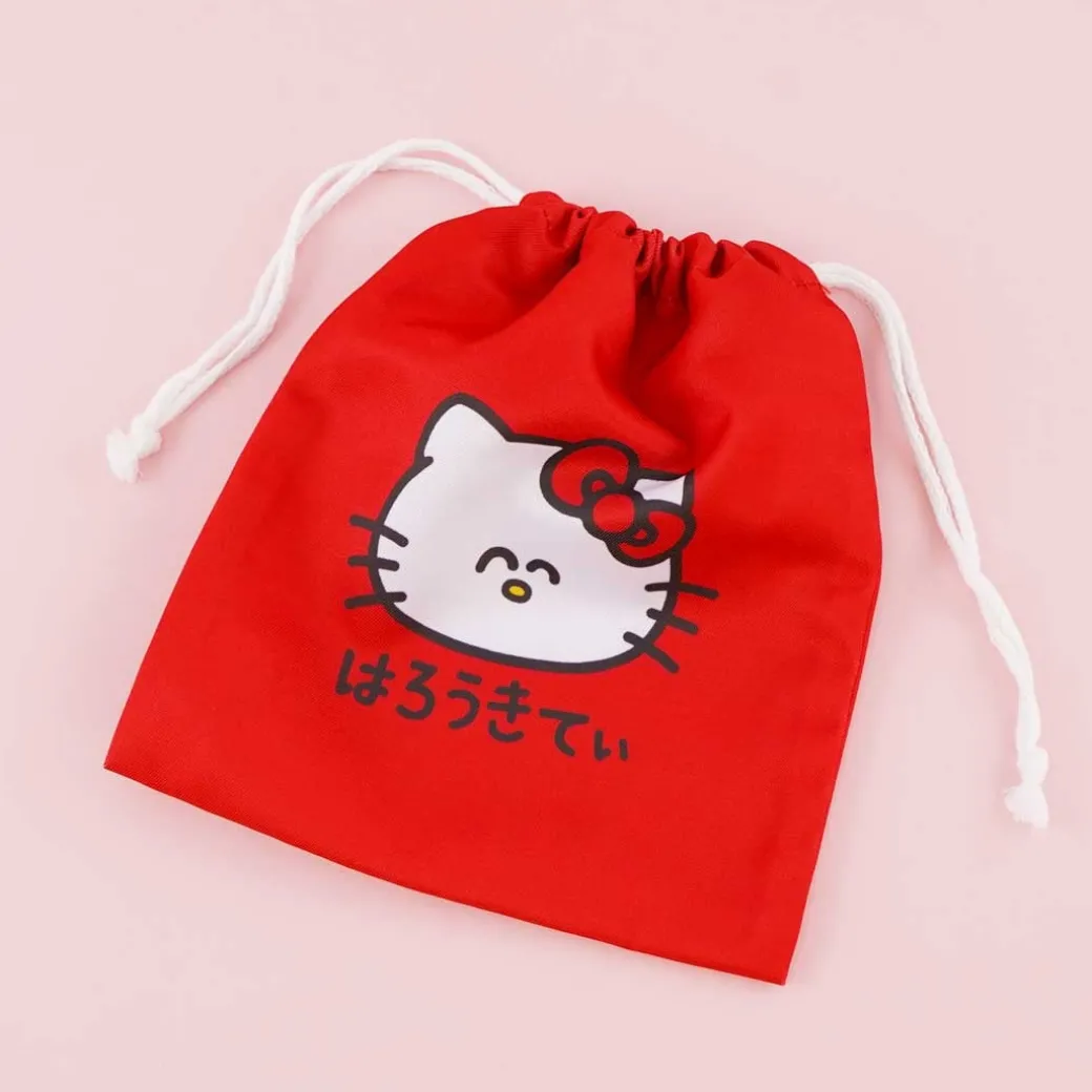 - A cute drawstring pouch featuring prints of Hello Kitty
