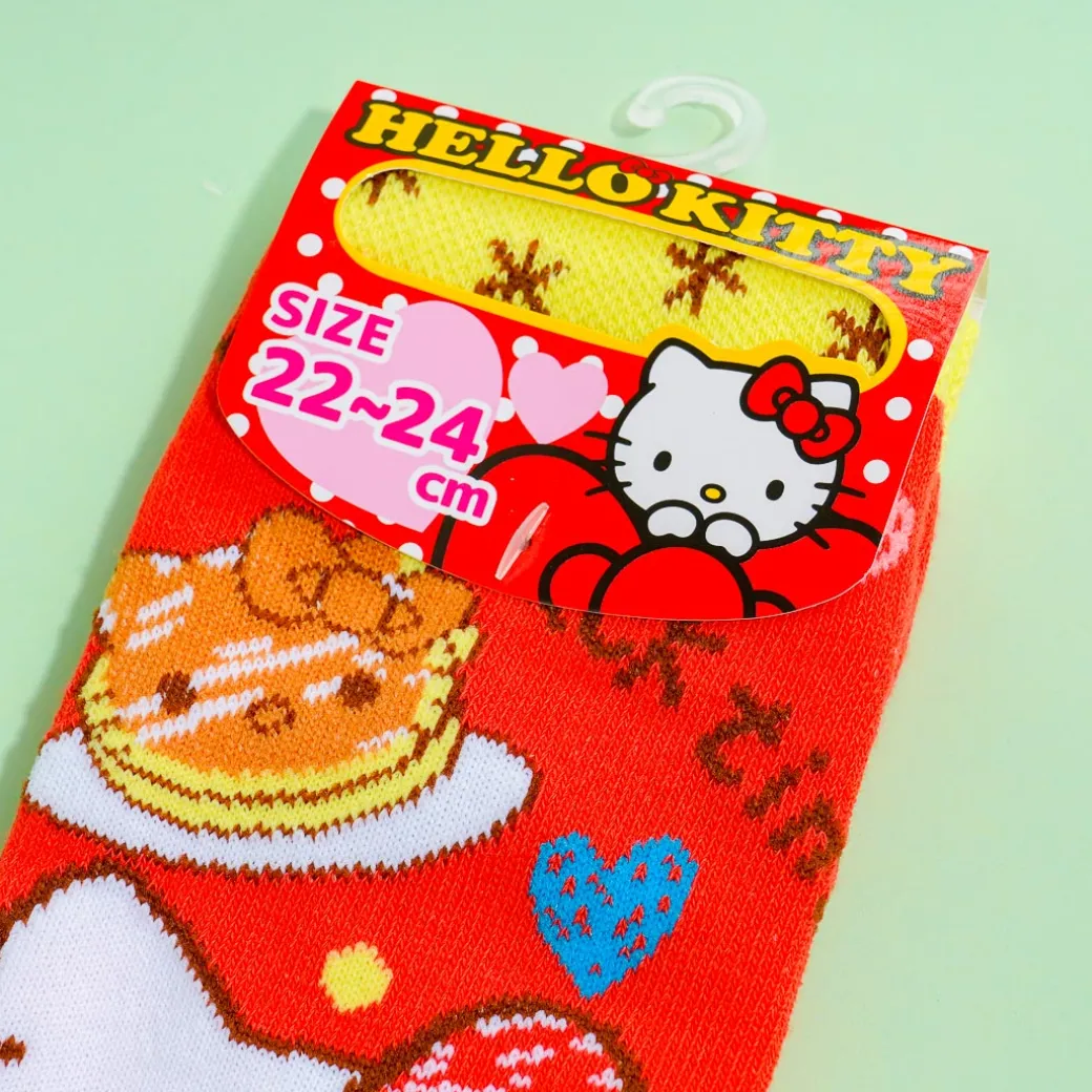 Stay warm and cute even when indoors by wearing this super cute pair! These red jacquard socks are decorated with colorful prints of Hello Kitty eating stacks of pancakes.