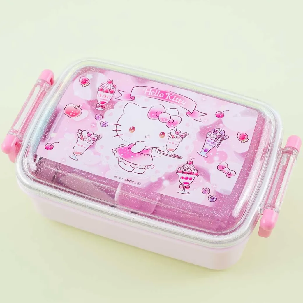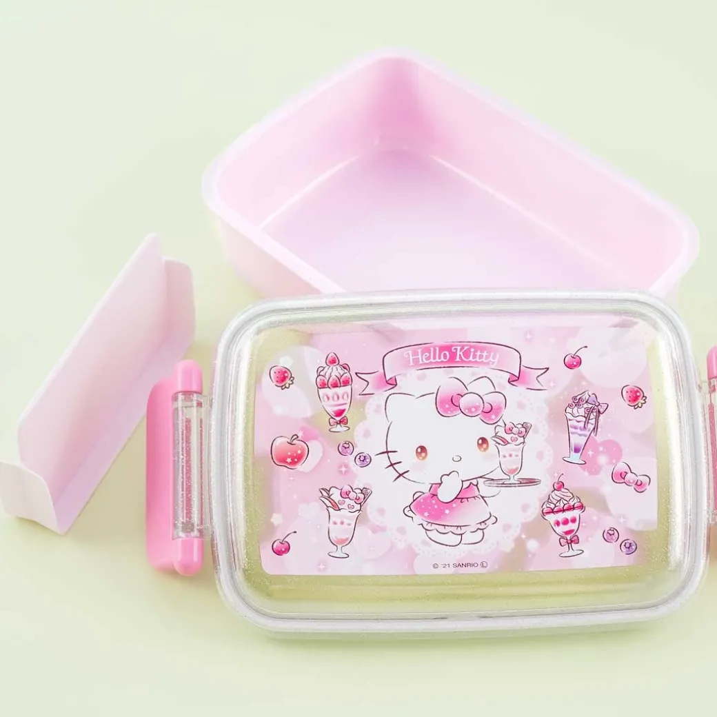 - A cute rectangular lunch box set with pastel prints of Hello Kitty dreaming about parfaits