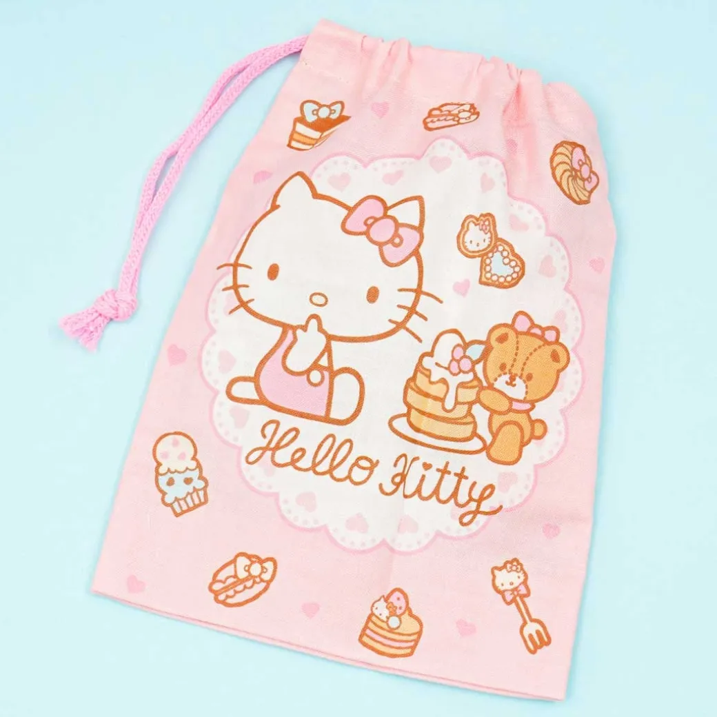 - A kawaii drawstring pouch decorated with illustrations of Hello Kitty and Tiny Chum surrounded by pastries