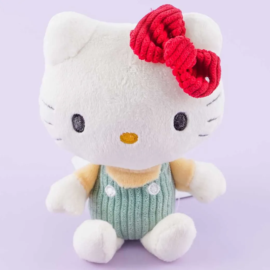 - A super cute medium-sized retro Hello Kitty bean plushie wearing corduroy overalls