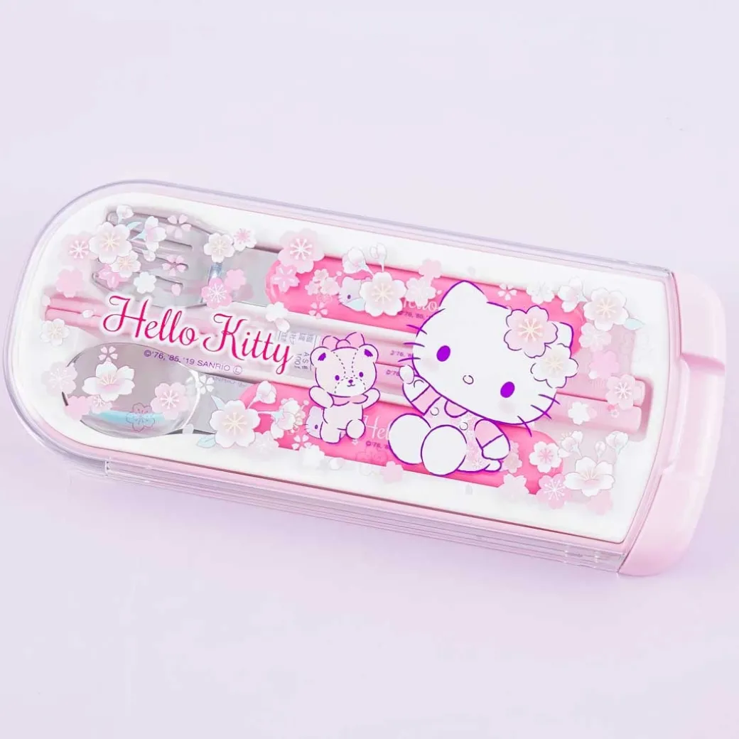 - A super cute utensil set illustrated with Hello Kitty enjoying the sakura blossom season
