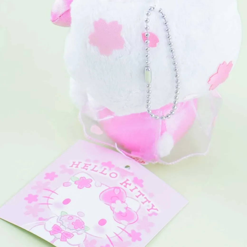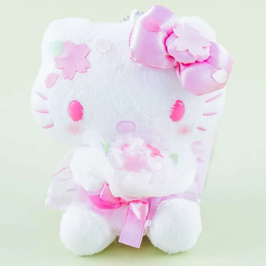 - A cute medium-sized Hello Kitty plushie wearing sakura accessories while carrying a bouquet