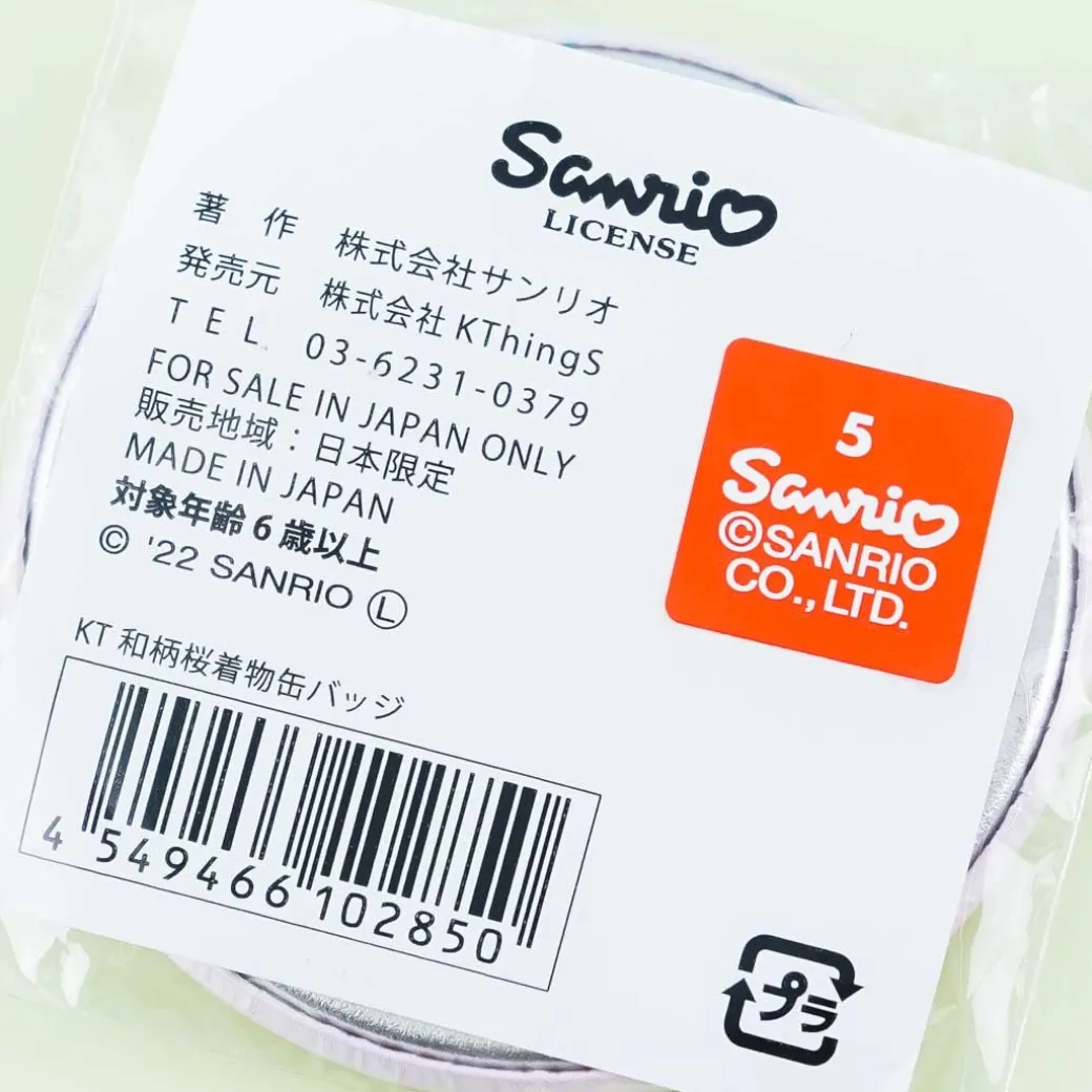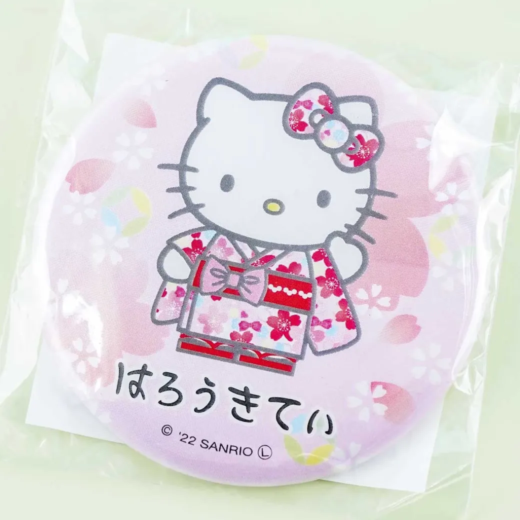 - A kawaii badge illustrated with Hello Kitty in a sakura kimono