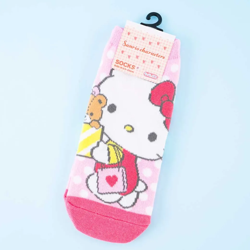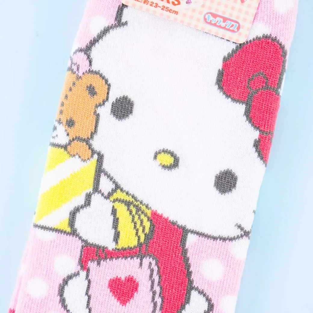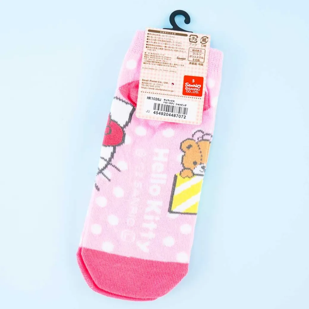- A cute pair of dotted socks featuring prints of Hello Kitty on a shopping spree