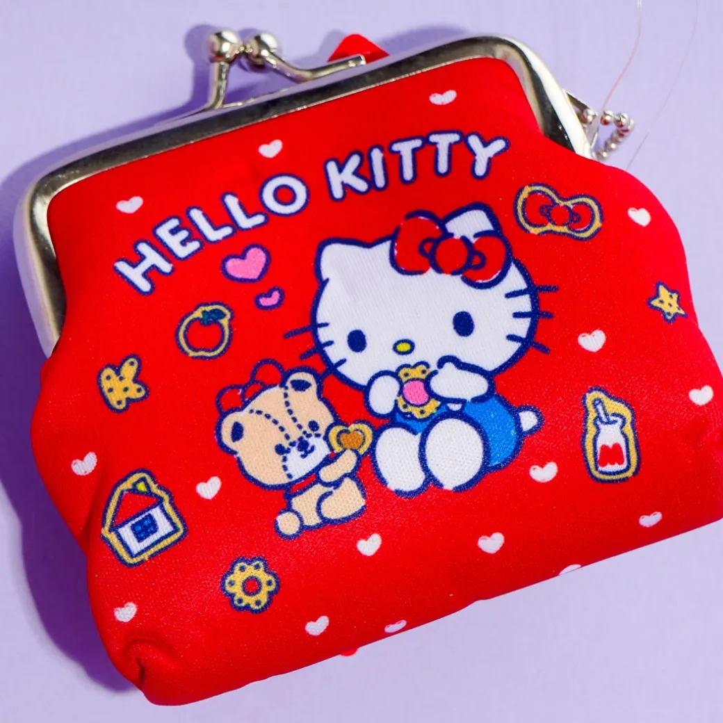 This kawaii red purse has a vintage-like print of Hello Kitty and Tiny Chum snacking on biscuits, milk, and apples! Keep your coins and cash safe and secured inside as it also comes with a convenient clasp closure.