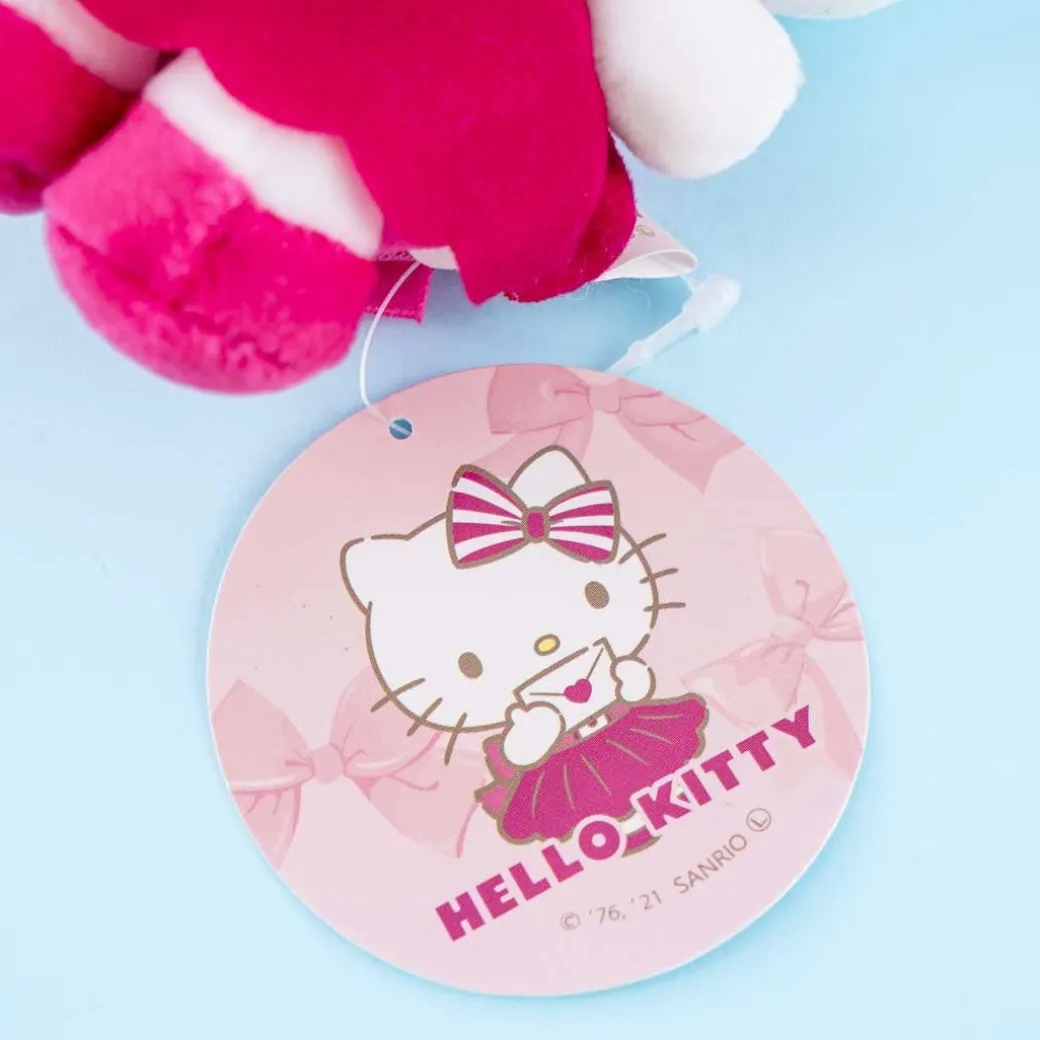 - A super kawaii Hello Kitty plushie dressed in pink with a striped ribbon