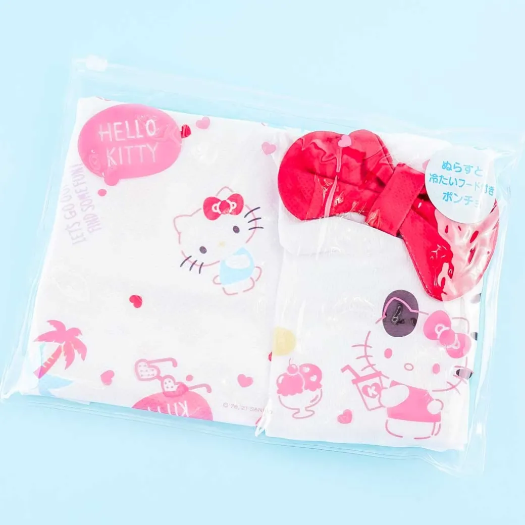 - A cute hooded towel featuring prints of Hello Kitty on vacation