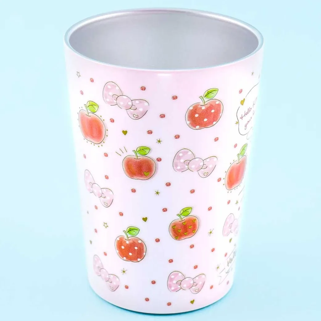 - A cute stainless steel tumbler featuring prints of Hello Kitty with apples
