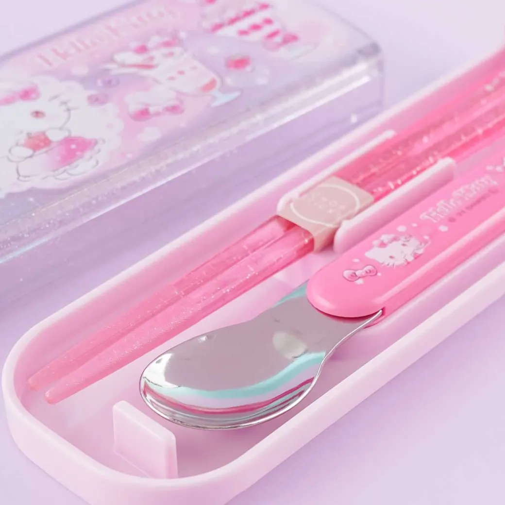 - A kawaii utensil set decorated with prints of Hello kitty and desserts