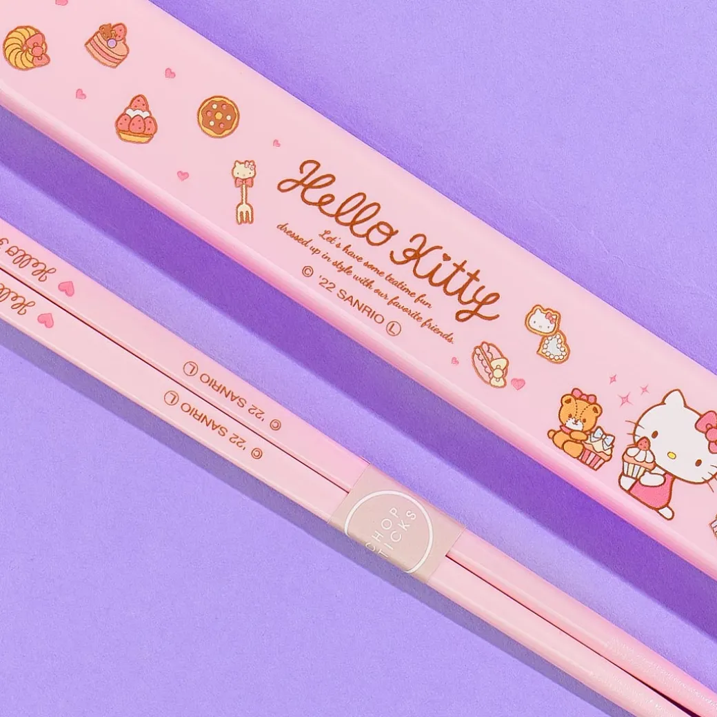 This kawaii pair of chopsticks is perfect for your school lunch! It features cute illustrations of Hello Kitty with desserts and a space where you can write your name. The chopsticks come in a matching plastic case with a sliding lid for easy storage.