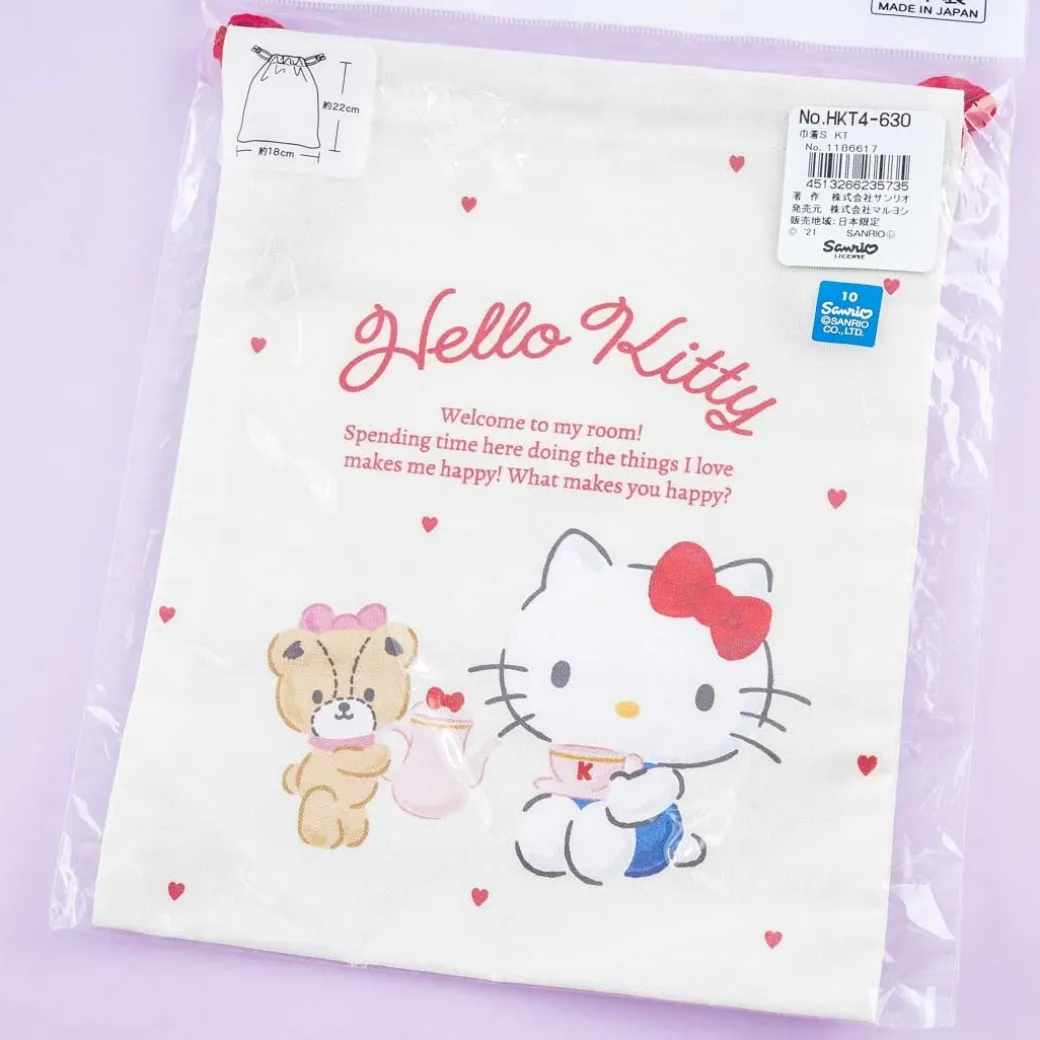 - A kawaii drawstring bag featuring Hello Kitty enjoying a cup of tea with Tiny Chum