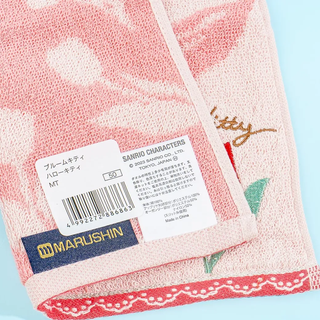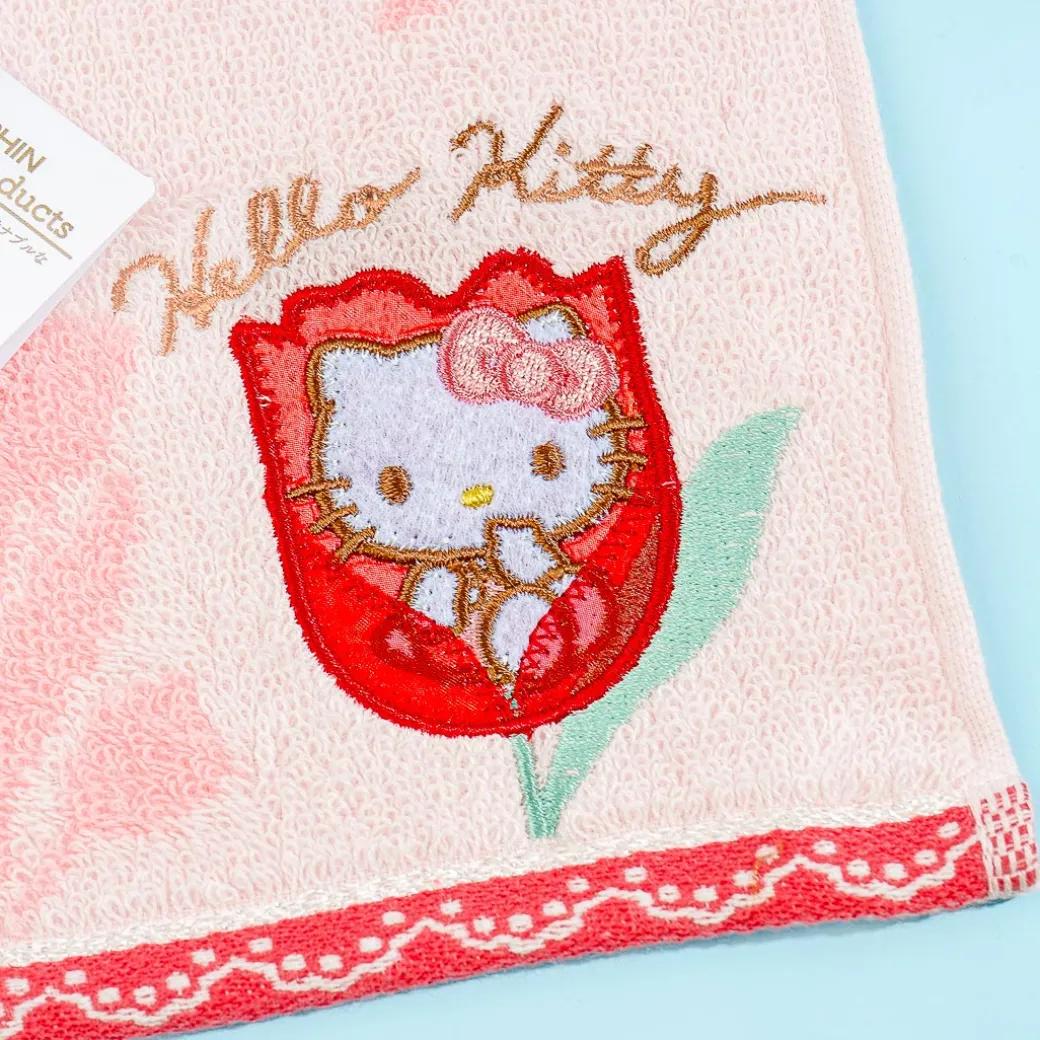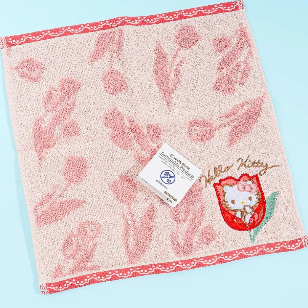 This super soft mini towel has prints of tulips and a kawaii embroidery of Hello Kitty sitting inside a tulip! Use this to wipe away sweat and dirt from your face or hands.