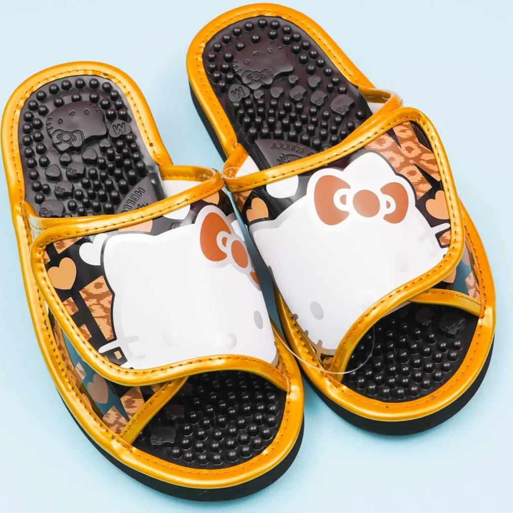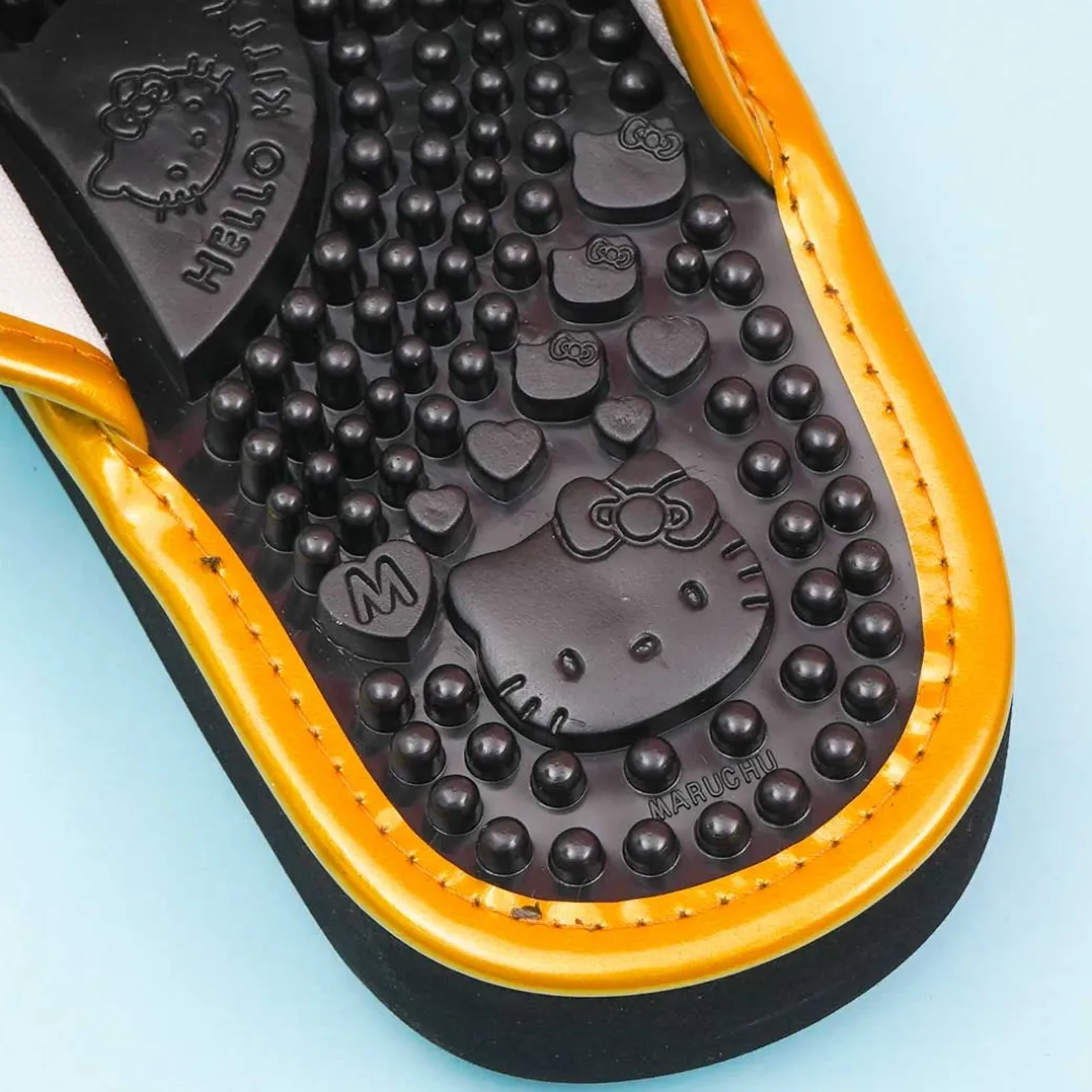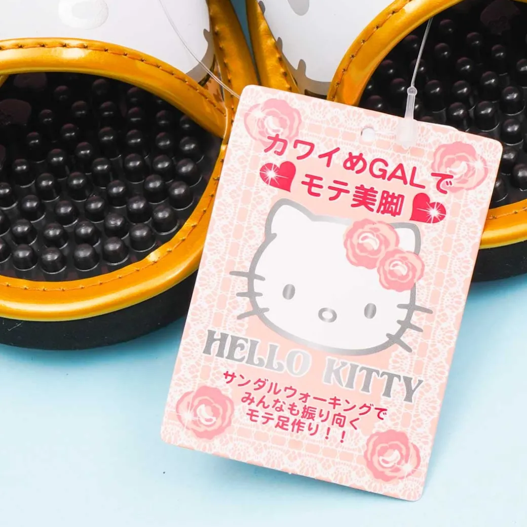 - A kawaii pair of golden adjustable velcro sandals illustrated with Hello Kitty