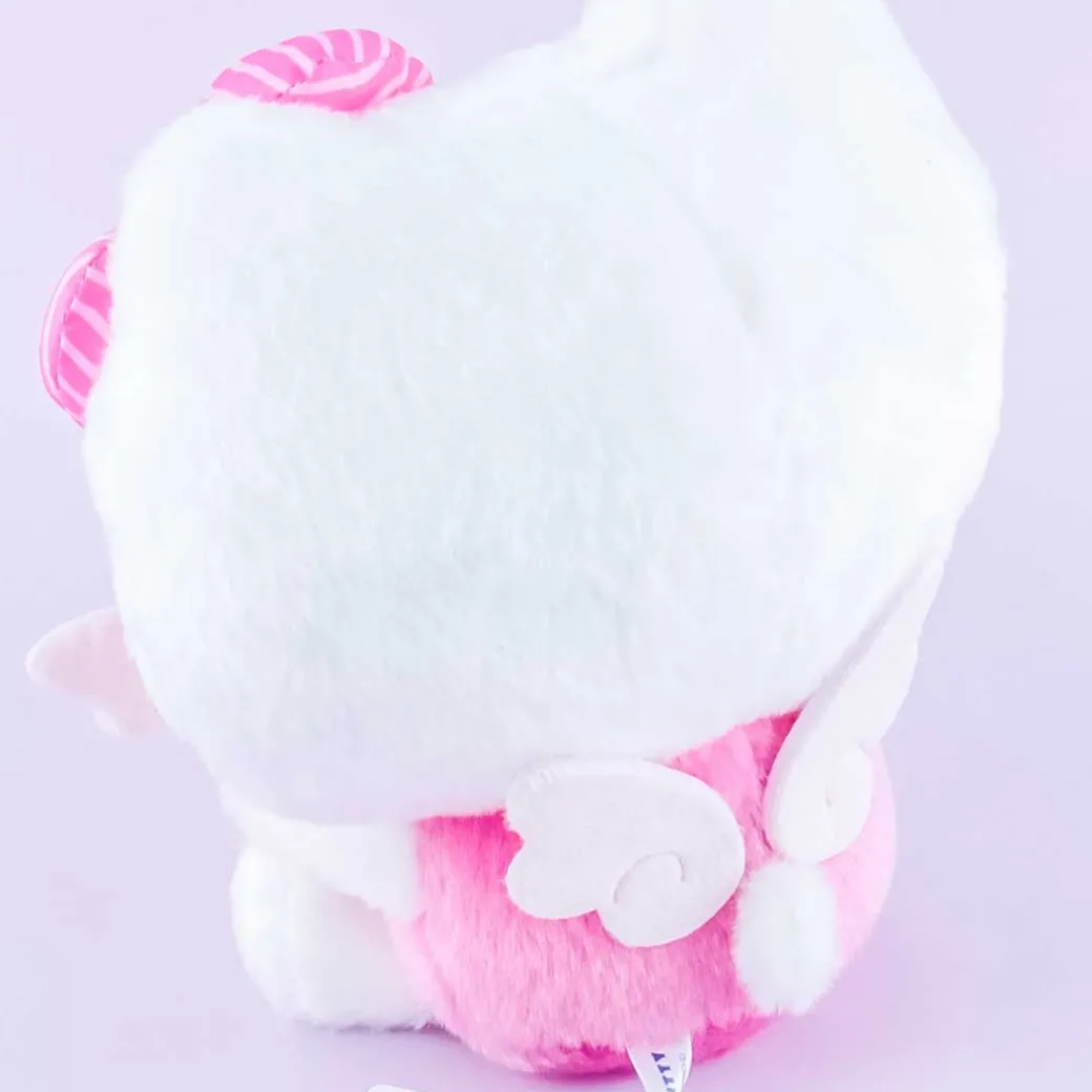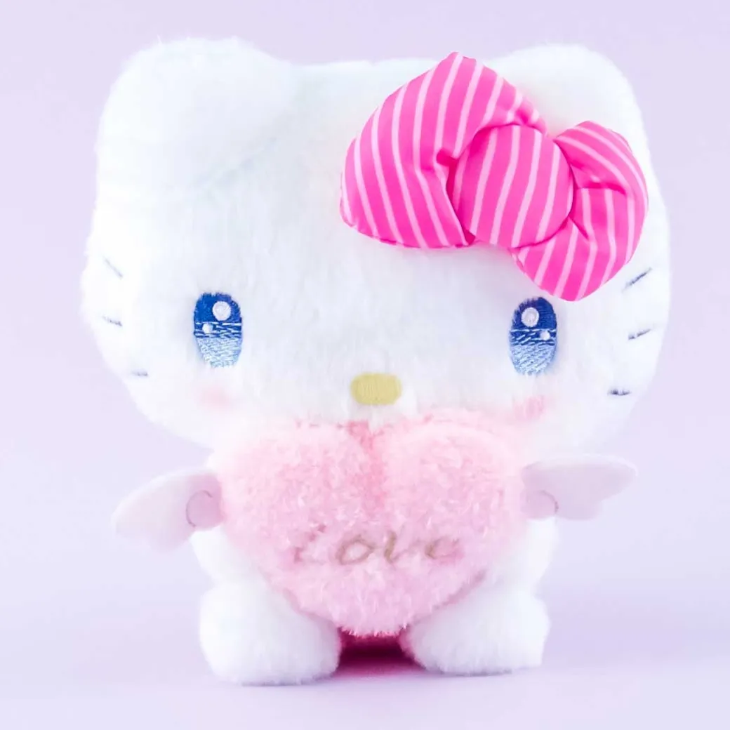 - A super cute and fluffy medium-sized Hello Kitty plushie carrying a winged heart with the word love