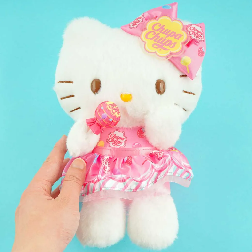 Have a fun time playing with this kawaii Hello Kitty plushie! This medium-sized cutie is wearing a fancy dress and matching bow that’s inspired by the popular colorful lollipop brand, Chupa Chups! This plushie is also holding a wand that looks like a Chupa Chups lollipop as well!