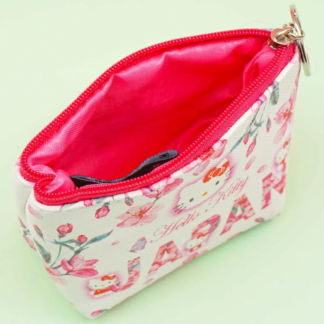 - A kawaii coin purse featuring Hello Kitty, flowers, and the country name Japan