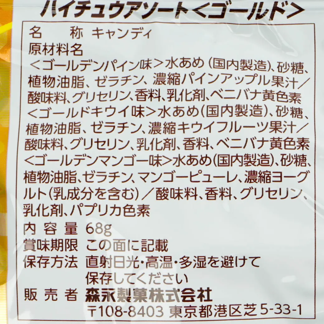 Three kinds of delicious golden fruit flavors are in this pack of assorted chewy candies—golden pineapple, golden kiwi, and golden mango. These candies have a unique soft and chewy texture. Share this pack with your friends!