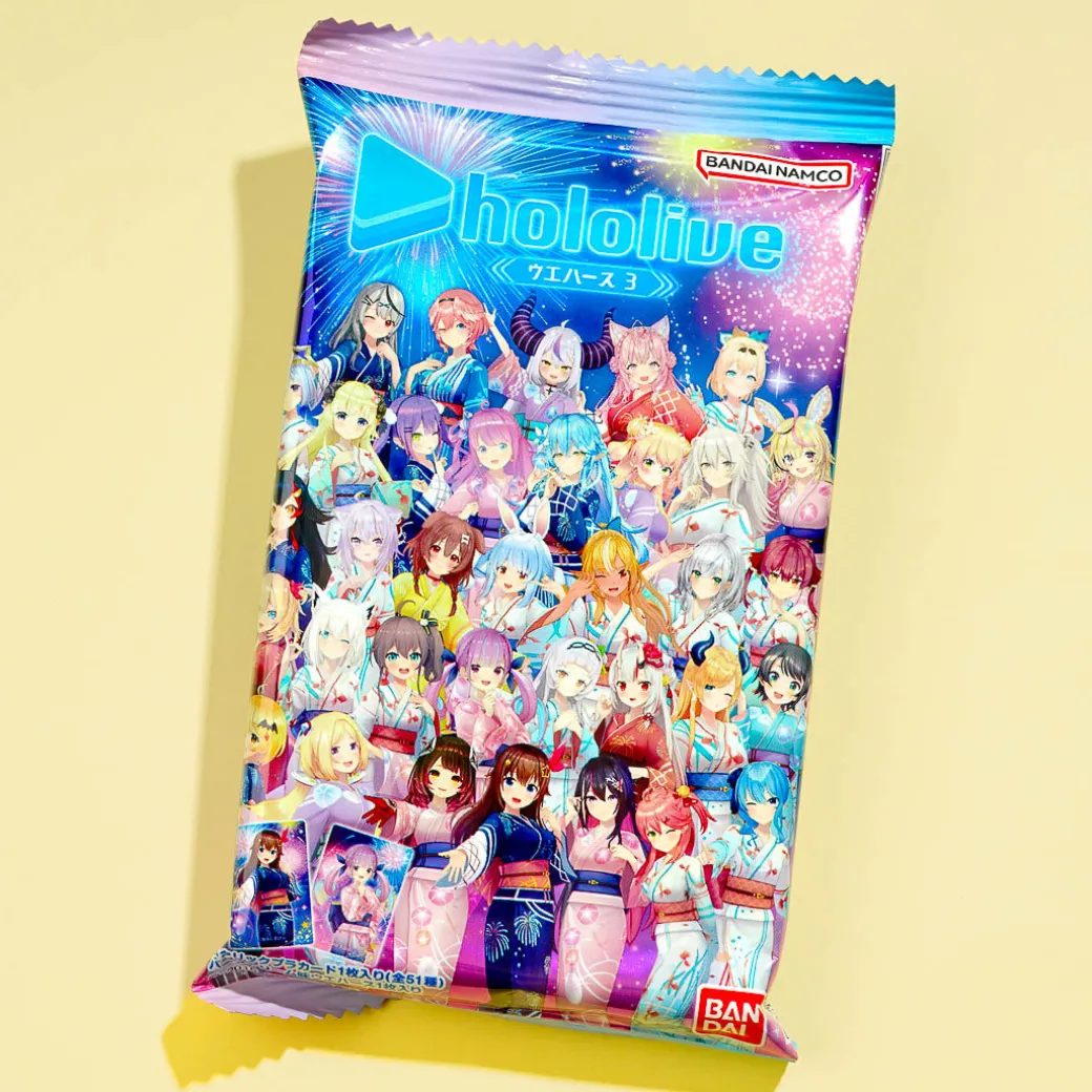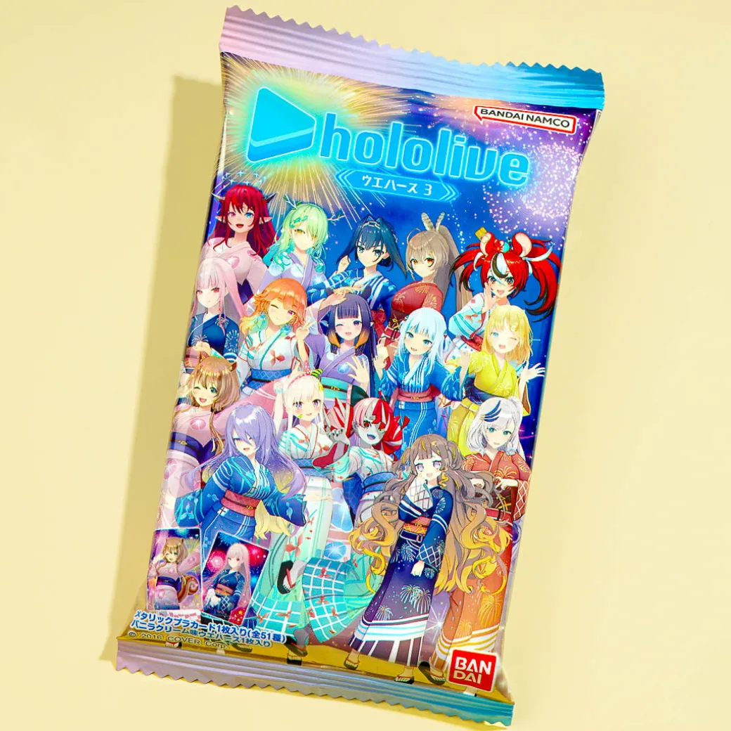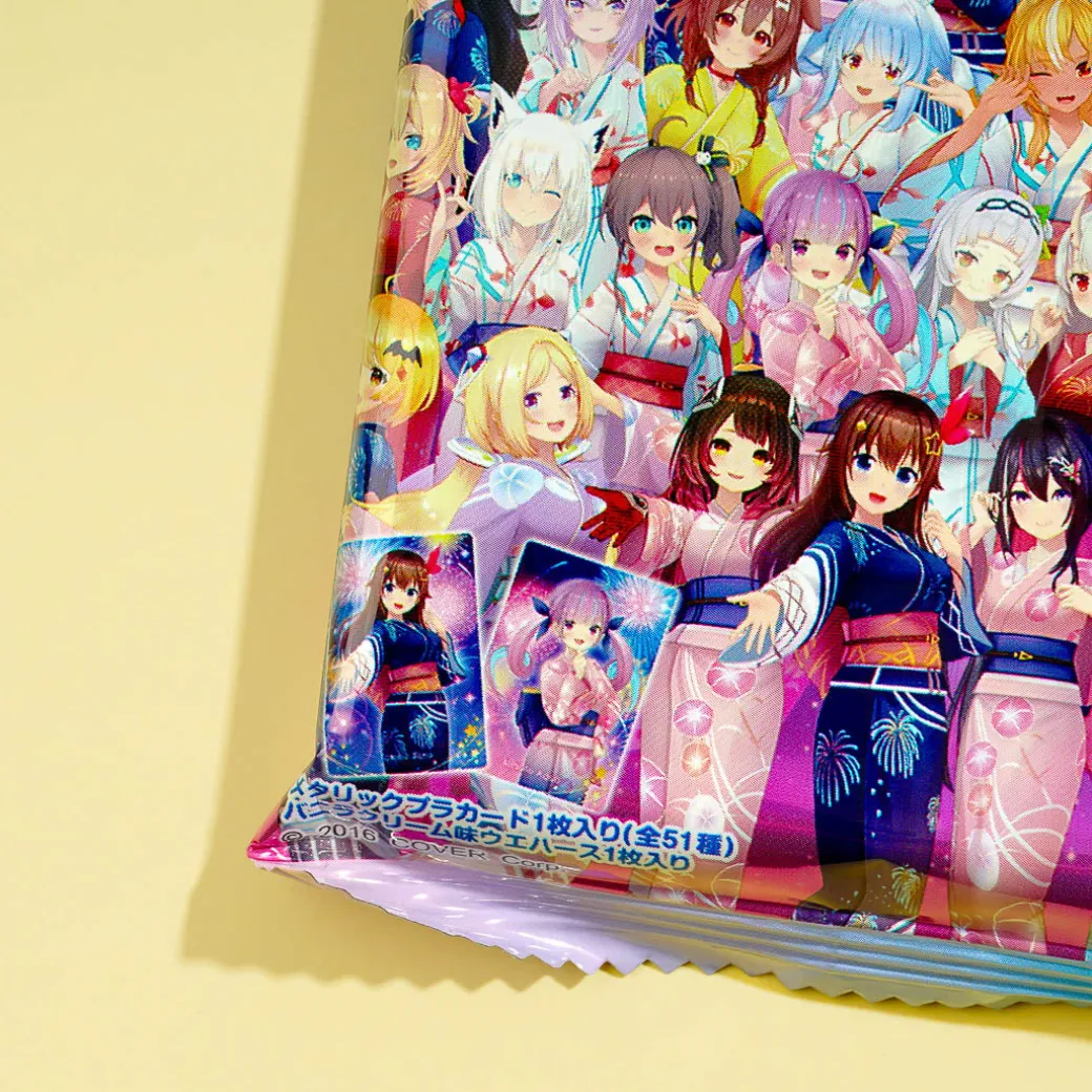 Snack on this delicious vanilla cream wafer pack featuring V-tubers from Hololive! This tasty treat comes with a collectible Hololive V-tuber card that you can add to your otaku haul. Surprise yourself with a random card from a set of 51 designs when you order.