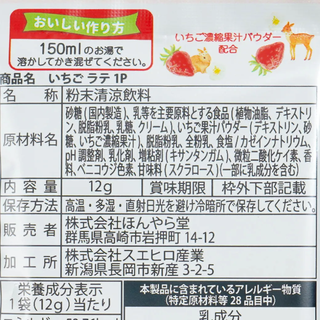 Enjoy this comforting drink after a hard day’s work! This instant drink powder makes a strawberry latte with a soft sweet and sour strawberry aroma. Simply mix it with hot or cold water!