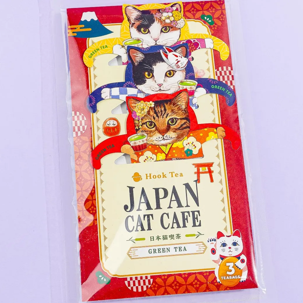 Kick back and relax this weekend with a cup of delicious warm green tea! These special tea bags have cat-shaped paper hooks so you can easily perch them on the edge of your teacup. The packaging also showcases different cats wearing colorful kimonos.