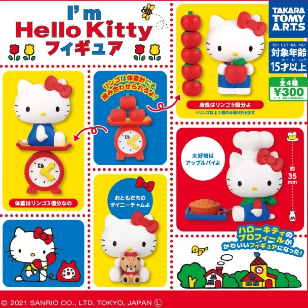 - Different designs available: Hello Kitty’s Height is 5 Apples, Hello Kitty’s Weight is 3 Apples, Hello Kitty’s Favorite Food is Apple Pie, and Hello Kitty & Tiny Chum