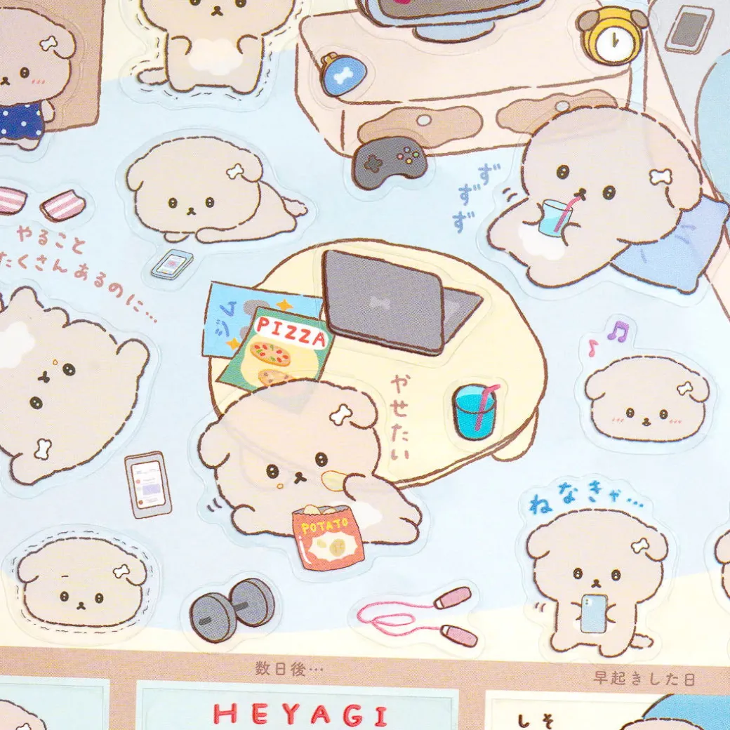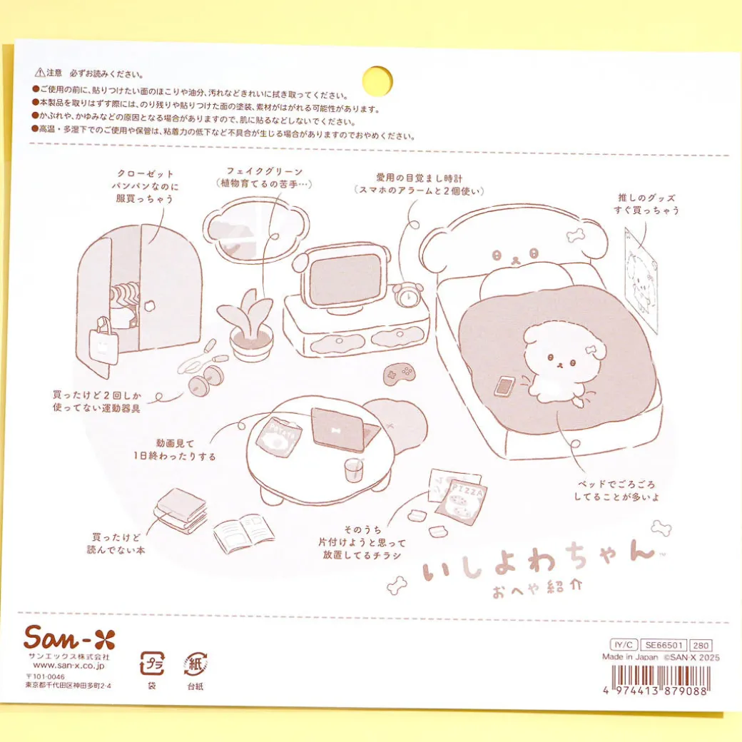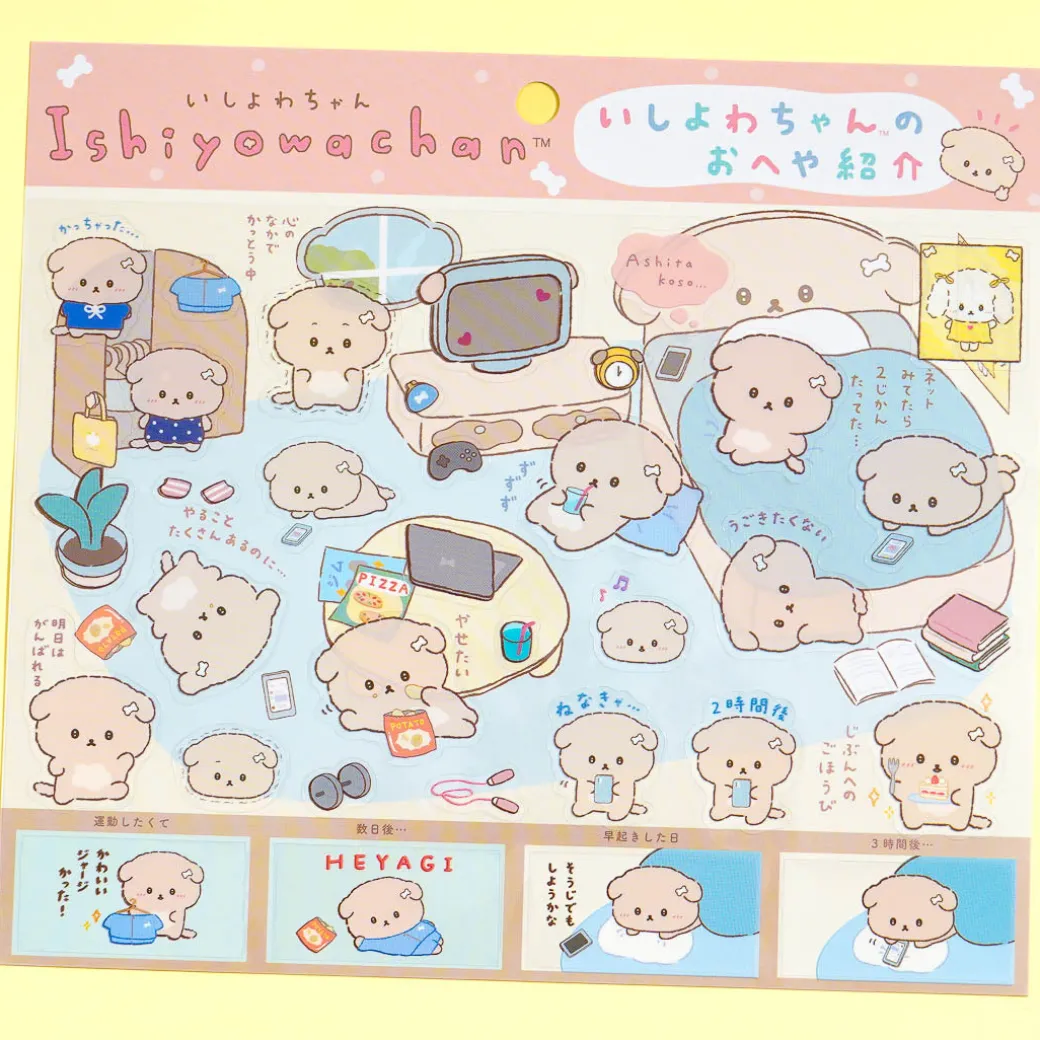 Have fun decorating using this super kawaii sticker set! It features Ishiyowa-Chan, the cute but weak-willed dog from San-X, and its friends inside a room. You can use all the stickers to create a room tour scene or use each one separately for decorating!