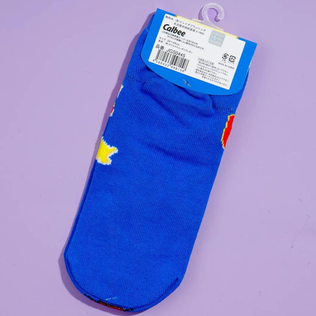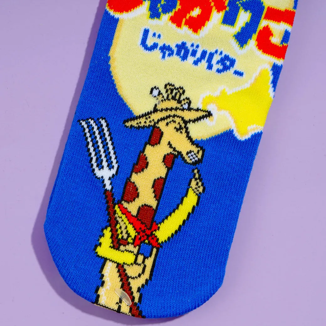 Keep your toes warm on a cold day using this kawaii pair of socks! It features a cute print inspired by the butter-flavored Calbee Jagariko potato snack and its giraffe mascot.