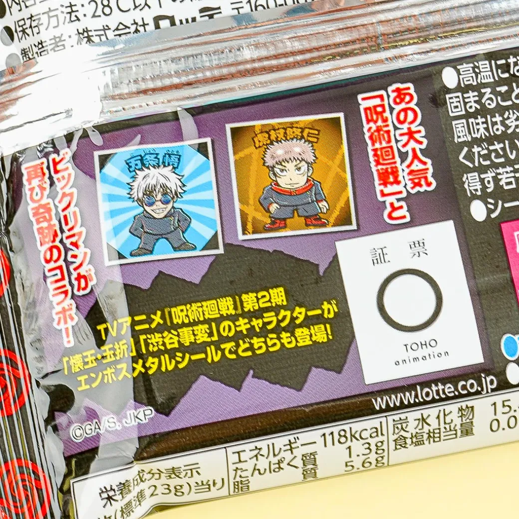 Snack on this yummy chocolate wafer pack while catching up on the latest season of Jujutsu Kaisen! Not only does this wafer pack feature Jujutsu Kaisen characters, but it also comes with a collectible sticker. Surprise yourself with a random Jujutsu Kaisen sticker design from a set of 24 when you order.