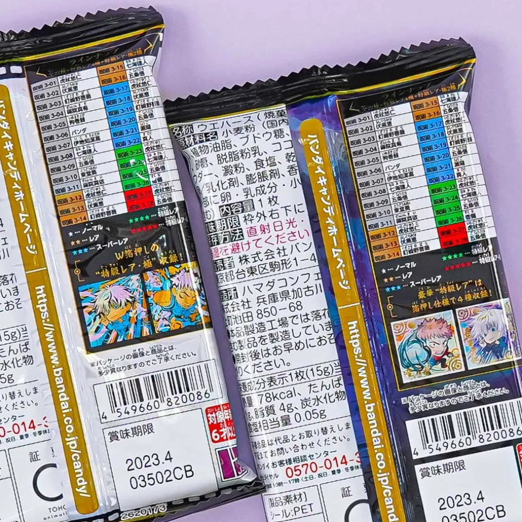 - A cocoa cream-flavored wafer pack featuring prints of the deformed version of Jujutsu Kaisen characters
