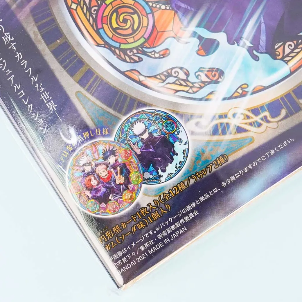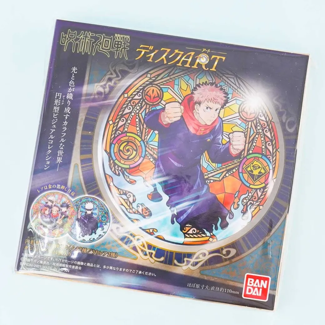 - A disc-shaped card collectible decorated with an illustration of a Jujutsu Kaisen character