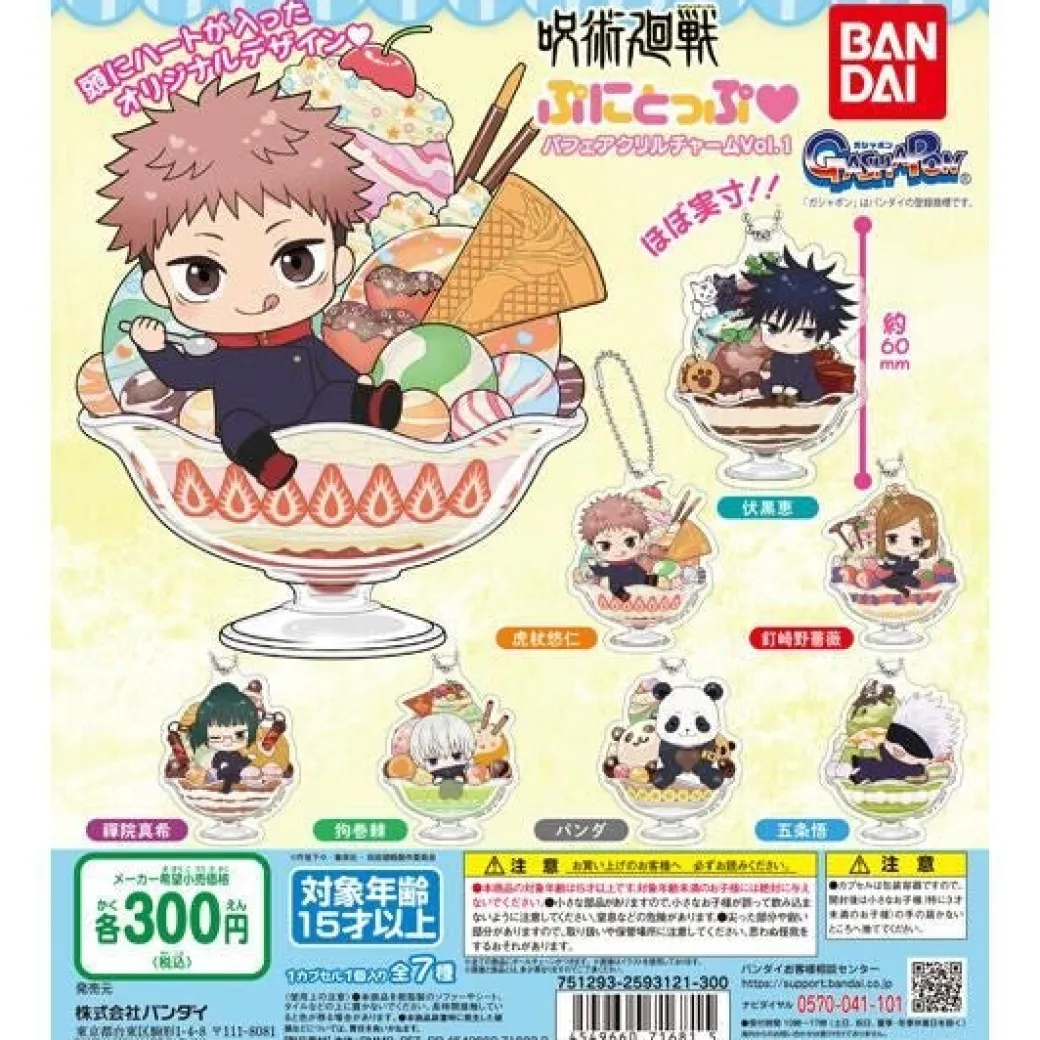 - A gachapon capsule with a die-cut charm collectible from the Jujutsu Kaisen Parfait Charm series