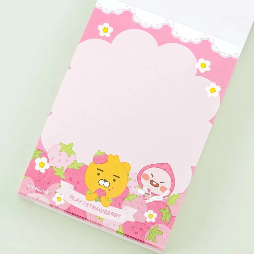 - A small memo pad with kawaii illustrations of Kakao Friends characters in strawberry costumes