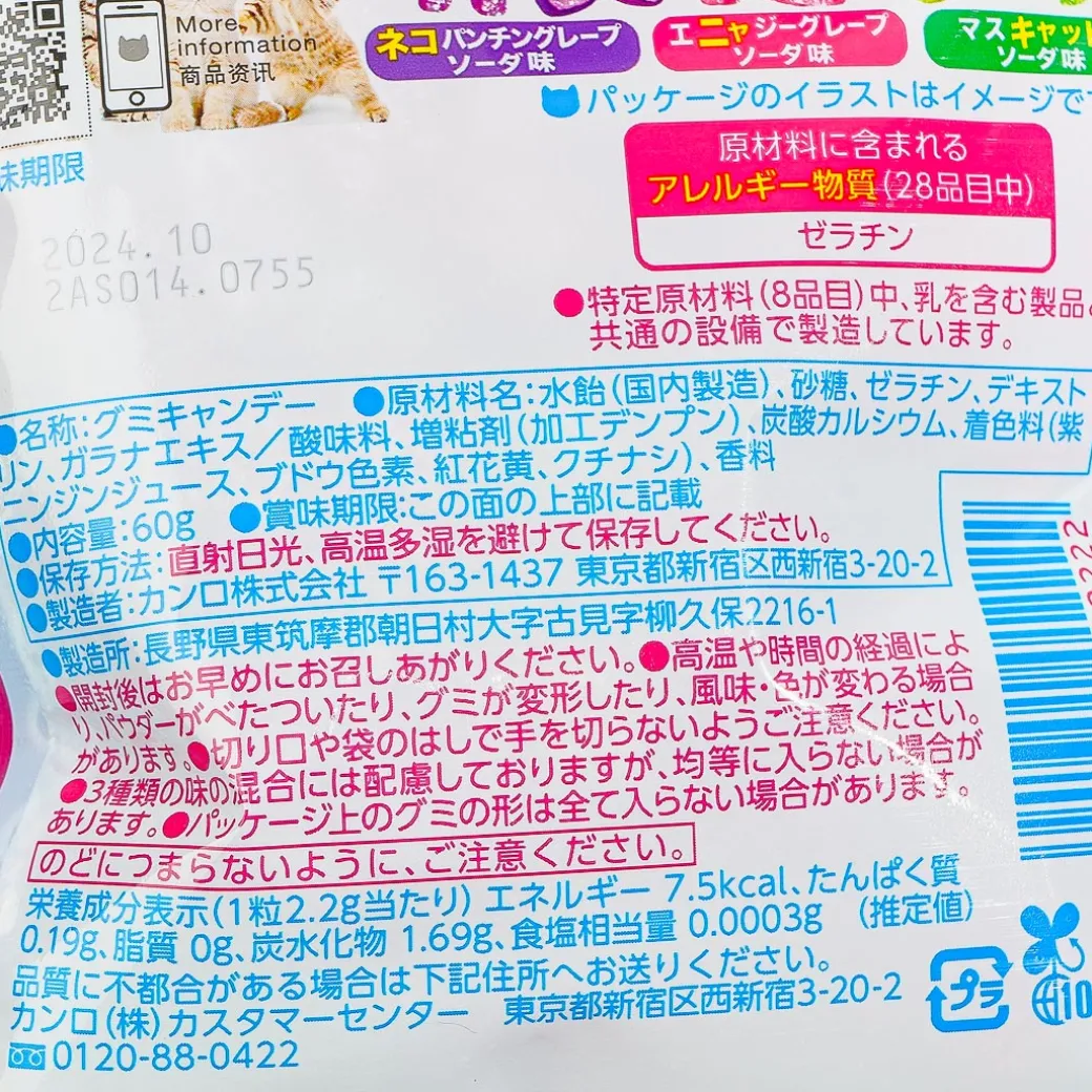 Satisfy your curiosity with this special edition Candemina candies! In celebration of “Cat Day,” the normal waved-shaped treats become Candeminya cat-shaped! These come in three different soda flavors: grape, muscat, and neko punching grape. Each piece is also generously coated with super sour powder to make your lips twitch!