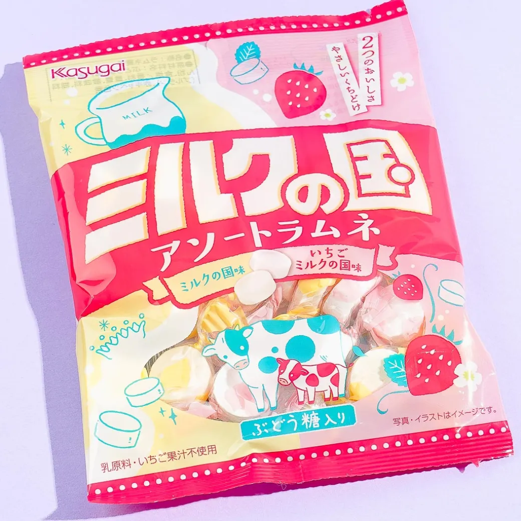 This pack of assorted ramune candies is perfect for sharing with your friends! It features two mild flavors — creamy milk and strawberry milk. These candies are made with Hokkaido milk so you can enjoy its creamy goodness!