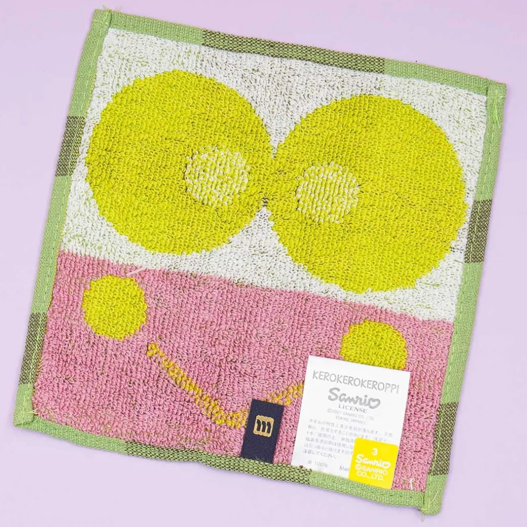 - A super kawaii hand towel showcasing a print of Keroppi’s face