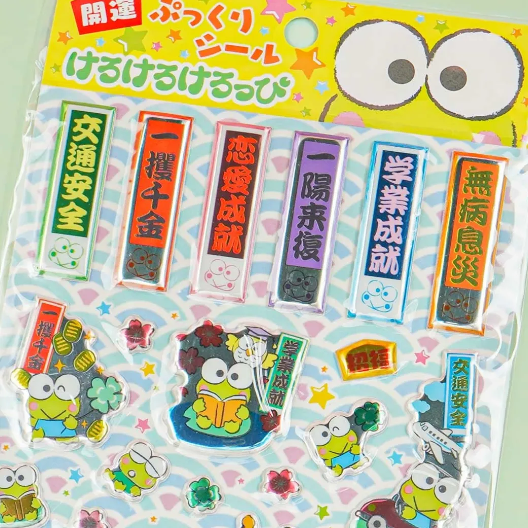 - A kawaii sheet of puffy stickers illustrated with a happy Keroppi and Japanese idioms