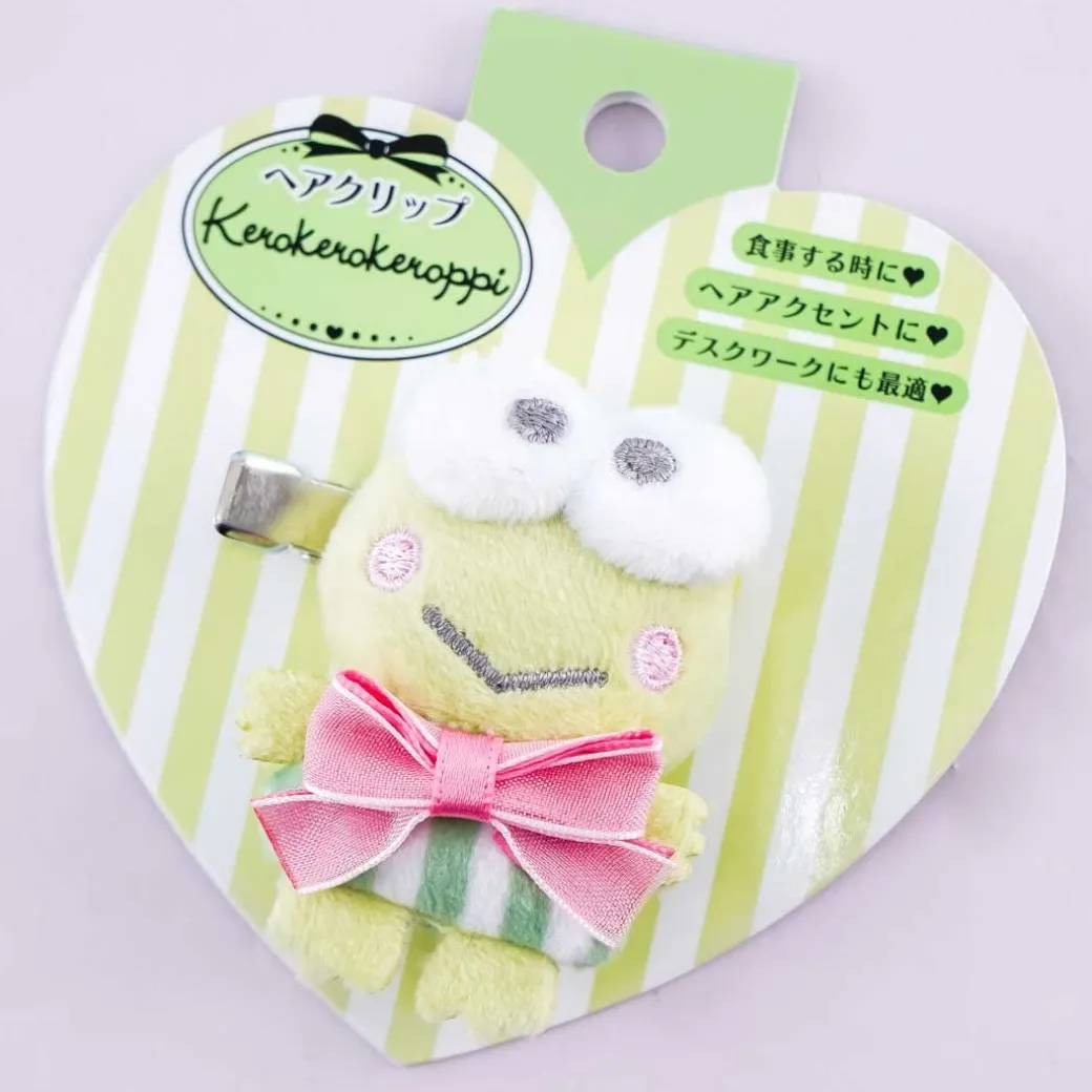 - A kawaii Kero Kero Keroppi plushie hair clip wearing a ribbon