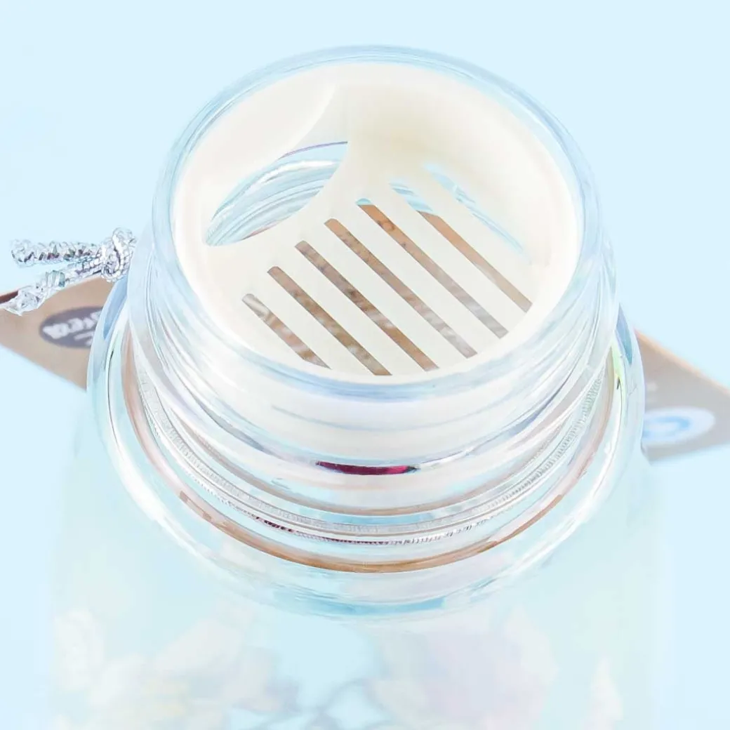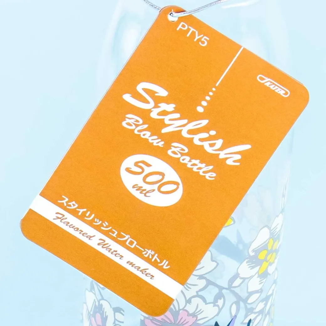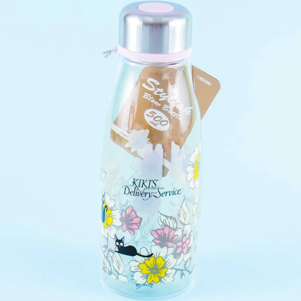 - A transparent floral water bottle featuring Jiji from Kiki’s Delivery Service
