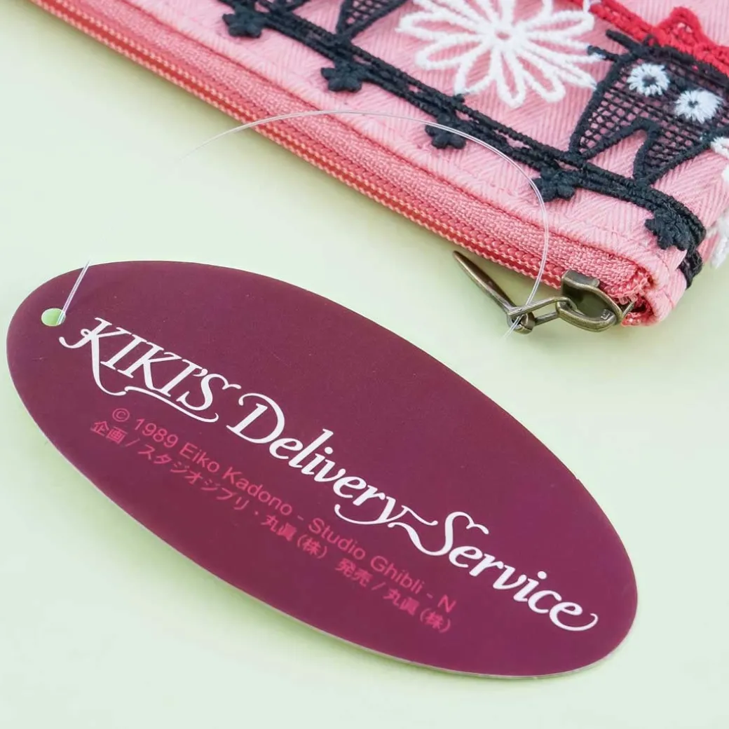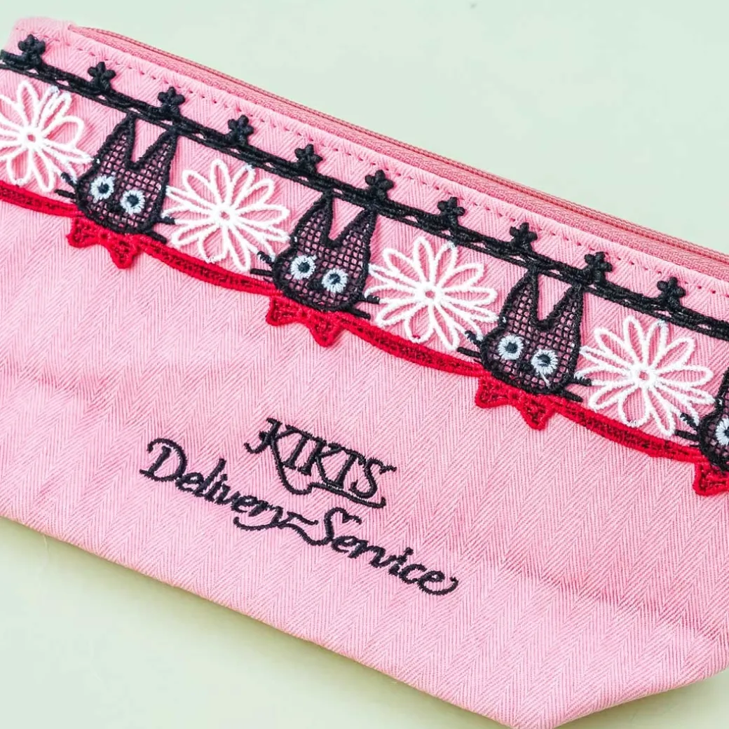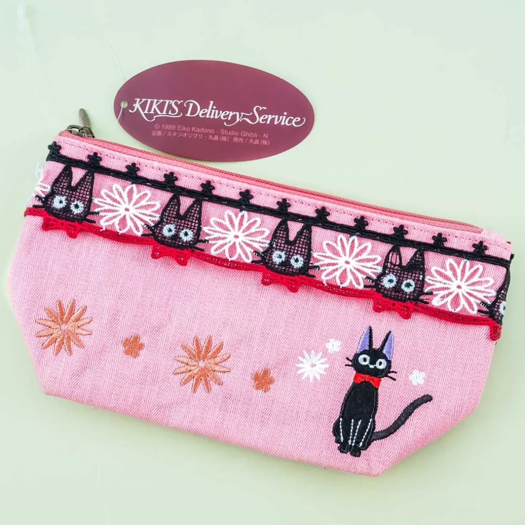 - A kawaii zippered pouch featuring embroidery of flowers and Jiji from Kiki’s Delivery Service