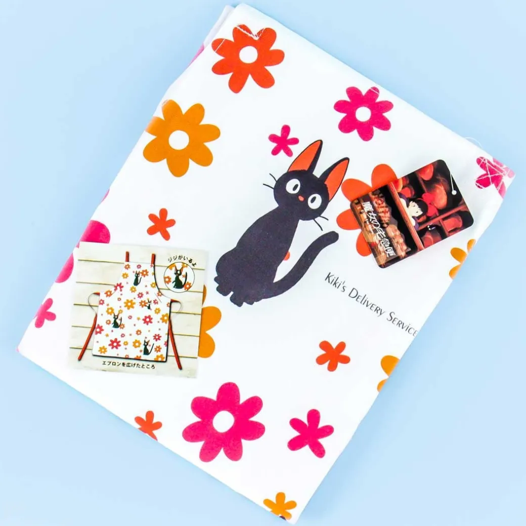 - A super cute apron illustrated with prints of Jiji from Kiki’s Delivery Service with flowers