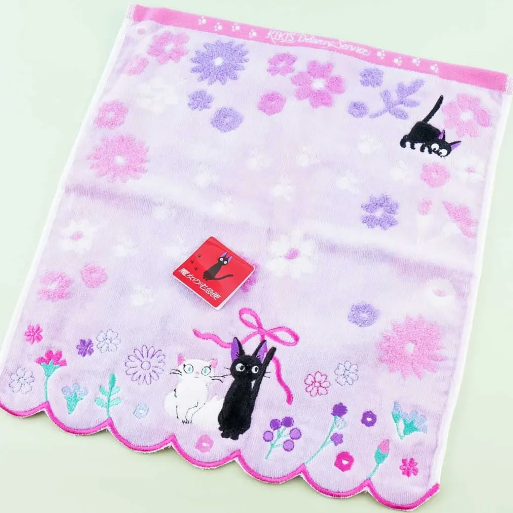 - A cute cotton hand towel with embroidery of Jiji from Kiki’s Delivery Service in a flower garden