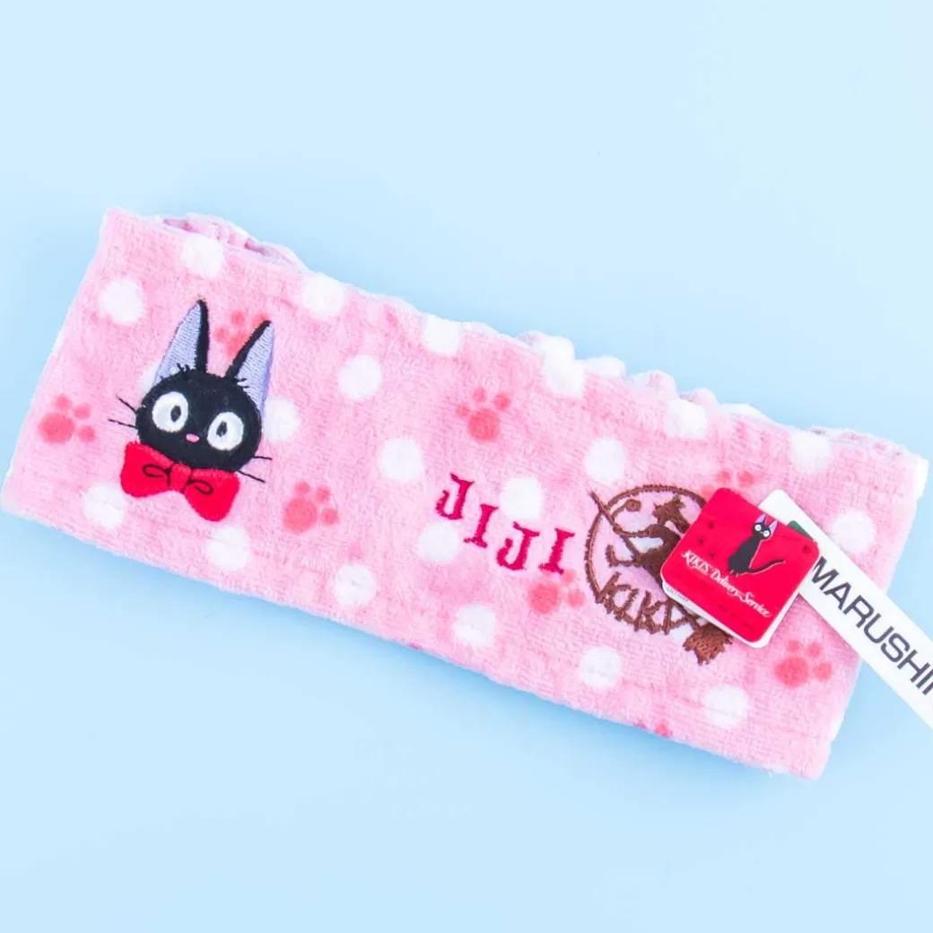 - A kawaii cloth headband featuring prints of Jiji the cat from Kiki’s Delivery Service with polka dots and paw prints