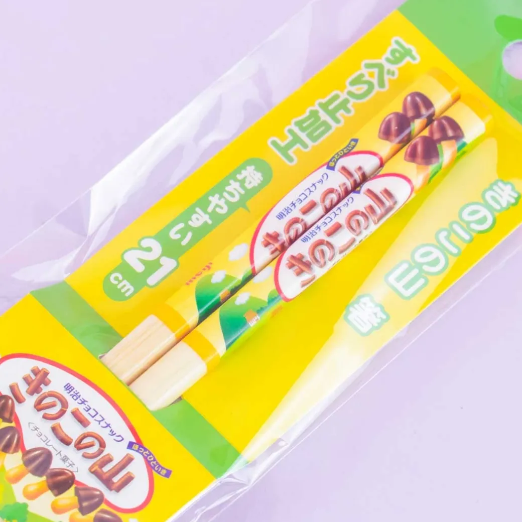 - A pair of bamboo chopsticks featuring prints of Kinoko no Yama biscuits