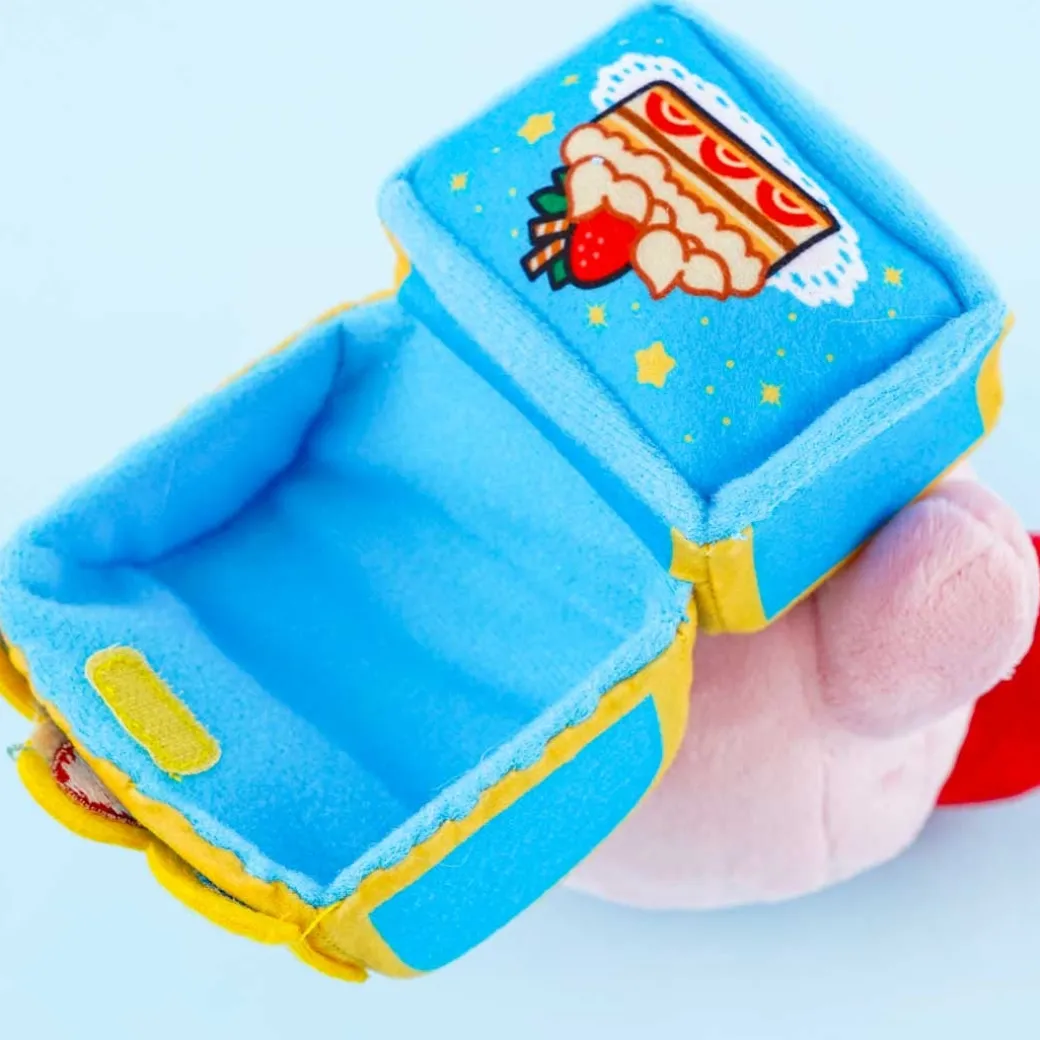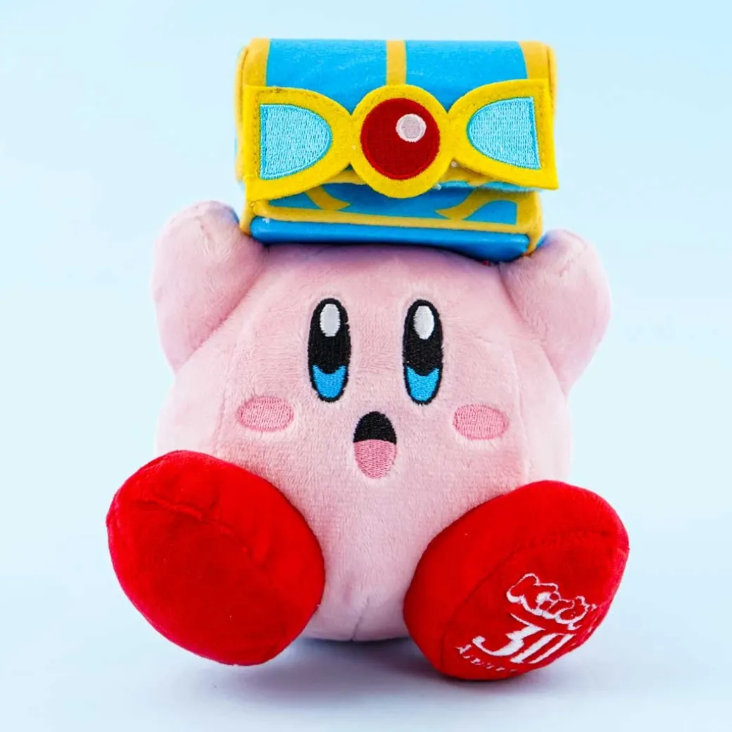 - A cute medium Kirby plushie holding a treasure box