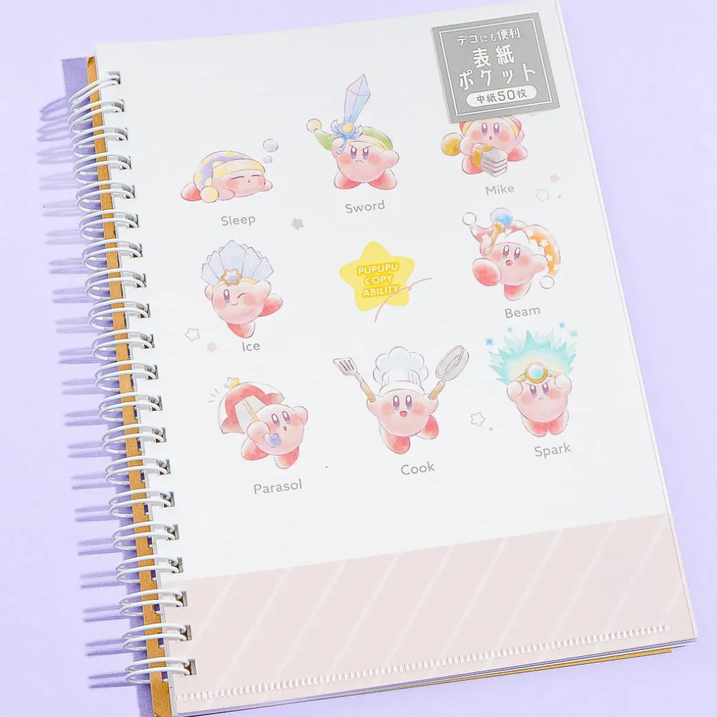 Practice your cursive handwriting and calligraphy using the lined pages of this kawaii spiral notebook! Its cover is decorated with super cute prints of Kirby’s famous “copy ability” game move.