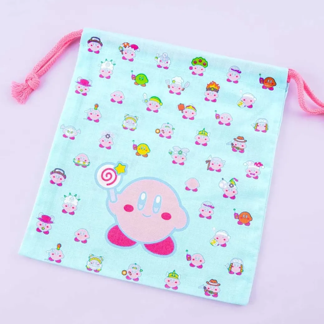 - A kawaii drawstring cotton pouch covered in prints of Kirby wearing different costumes